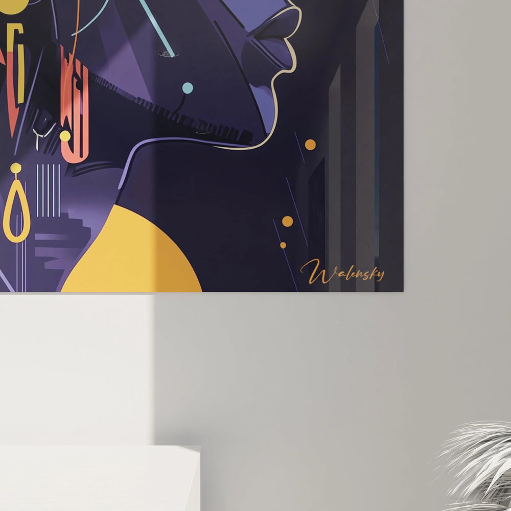 Ce tableau femme africaine présente un portrait saisissant d'une femme de profil, ornée de motifs géométriques traditionnels et de bijoux colorés. L'œuvre capture immédiatement l'attention par sa composition moderne qui mélange l'art contemporain aux références culturelles africaines. Le tableau femme africaine motifs traditionnels révèle une technique numérique sophistiquée, où chaque détail des parures et ornements contribue à créer une identité visuelle forte. Les éléments décoratifs intégrés dans la chevelure et sur le visage témoignent d'un travail minutieux de stylisation, faisant de cette œuvre un exemple remarquable d'art moderne inspiré des traditions africaines.