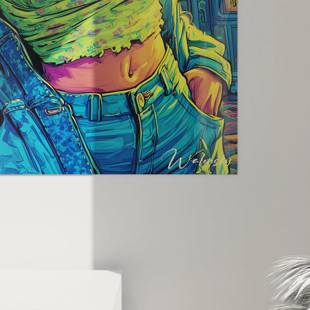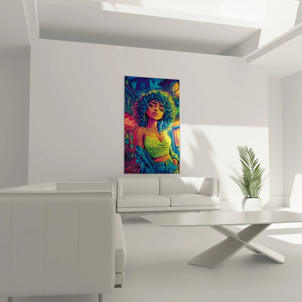 Ce tableau mural femme afro présente un portrait saisissant d'une femme aux cheveux bouclés colorés dans un environnement urbain nocturne. L'illustration de style bande dessinée capture parfaitement l'essence du street art contemporain avec ses couleurs vives et contrastées. La protagoniste porte un top jaune-vert et une veste en jean, ses cheveux volumineux arborant des nuances de bleu, violet et jaune qui se fondent harmonieusement avec l'éclairage néon de la rue. Ce tableau art urbain révèle un décor de ville la nuit avec des enseignes lumineuses, des vitrines éclairées et une architecture typiquement urbaine. L'artiste a su créer une atmosphère cinématographique où chaque détail contribue à l'impact visuel global. Les couleurs néon dominent la composition, créant un contraste saisissant entre les tons chauds du personnage et les teintes froides de l'environnement nocturne. Cette œuvre d'art digital s'inspire clairement des codes esthétiques du comic book américain tout en apportant une modernité urbaine contemporaine. Le tableau décoratif moderne s'adresse particulièrement aux amateurs d'art urbain et de culture hip-hop, offrant une représentation positive et puissante de la féminité dans l'univers street art.