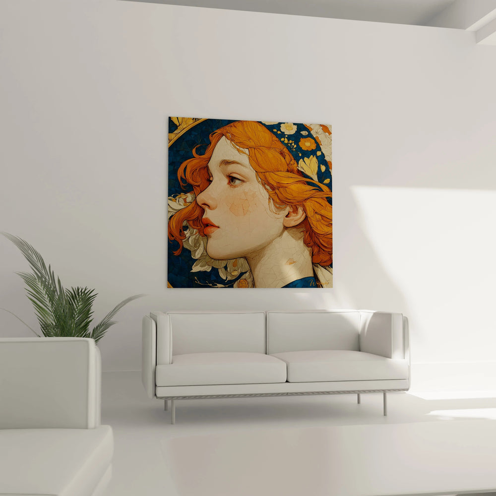 Cette œuvre présente des caractéristiques visuelles distinctives qui la rendent immédiatement reconnaissable. Le tableau femme cheveux roux se distingue par sa palette chromatique raffinée, dominée par les tons cuivrés des cheveux qui contrastent magnifiquement avec le fond bleu intense. La technique de fragmentation subtile de la surface crée un effet de mosaïque délicate, particulièrement visible sur le visage et les zones de chair. Les lignes fluides et organiques des cheveux s'harmonisent parfaitement avec les motifs floraux environnants. Cette art mural femme Art nouveau révèle une approche décorative où chaque élément participe à l'harmonie générale. La position de profil permet une mise en valeur optimale de la silhouette gracieuse et des détails capillaires remarquablement travaillés.