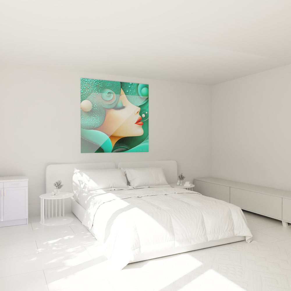 Ce tableau mural femme présente une œuvre captivante mêlant réalisme et abstraction dans une harmonie parfaite. Le portrait féminin se distingue par sa chevelure turquoise composée de multiples bulles et sphères cristallines qui créent un effet de profondeur saisissant. La femme de profil arbore des traits délicats avec des lèvres rouge vermillon qui contrastent magnifiquement avec la palette dominante. Cette peinture figurative moderne transforme la chevelure en un véritable océan de nuances turquoise, du plus pâle au plus intense. Les bulles cristallines semblent flotter dans un univers aquatique fantastique, créant un mouvement perpétuel autour du visage serein. L'artiste a su capturer l'essence féminine tout en y apportant une dimension onirique unique. Ce tableau décoratif contemporain joue sur les contrastes entre la peau nacrée et les tons turquoise iridescents. La technique mixte associe des éléments hyperréalistes pour le visage à une approche plus abstraite pour la chevelure, créant ainsi une œuvre d'art mural moderne d'exception.