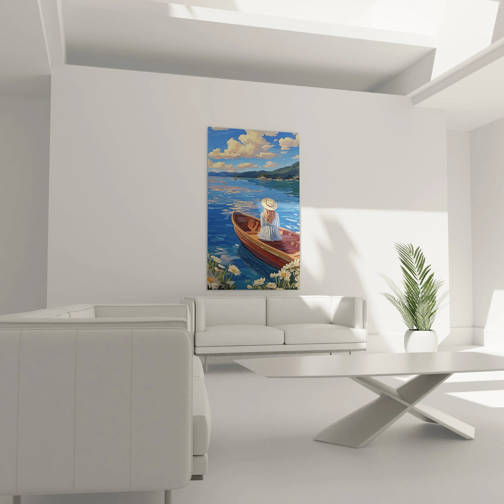 Laissez-vous emporter par l’élégance et la sérénité du Tableau Femme Barque Flottante - édition été. Ce tableau exceptionnel est plus qu'une simple œuvre d'art ; c'est un voyage sensoriel qui transforme votre espace en un havre de paix estivale. Imaginez-vous sur une douce brise, bercé par les vagues, tandis que la lumière du soleil danse sur l'eau cristalline. Voilà l'essence même que nous avons capturée dans ce chef-d'œuvre.