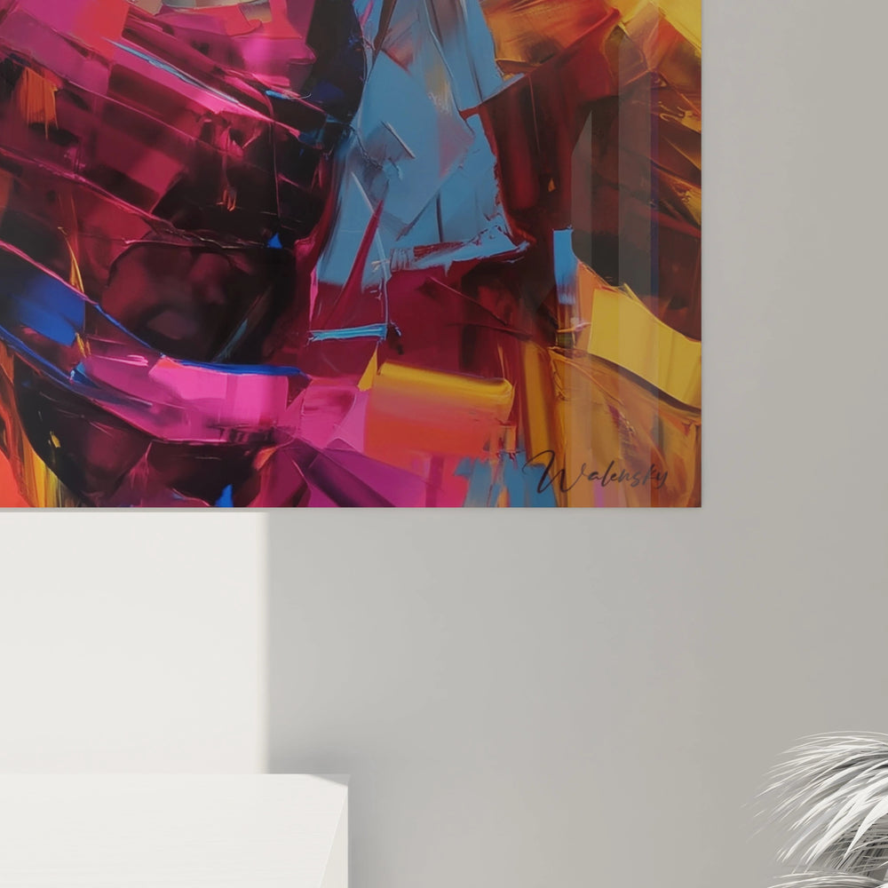 Cette œuvre d'art contemporaine présente une tableau femme aux tonalités vibrantes et à la composition saisissante. L'artiste a créé une représentation moderne où les couleurs éclatantes dominent l'ensemble de la composition. Le tableau femme contemporaine cubiste se distingue par son approche fragmentée et ses contrastes chromatiques puissants. La figure féminine centrale émerge d'un chaos organisé de formes géométriques, créant une tension visuelle captivante. Cette décoration murale femme moderne interpelle immédiatement le regard par sa dynamique colorée et son style distinctif qui mélange réalisme figuratif et abstraction géométrique.
