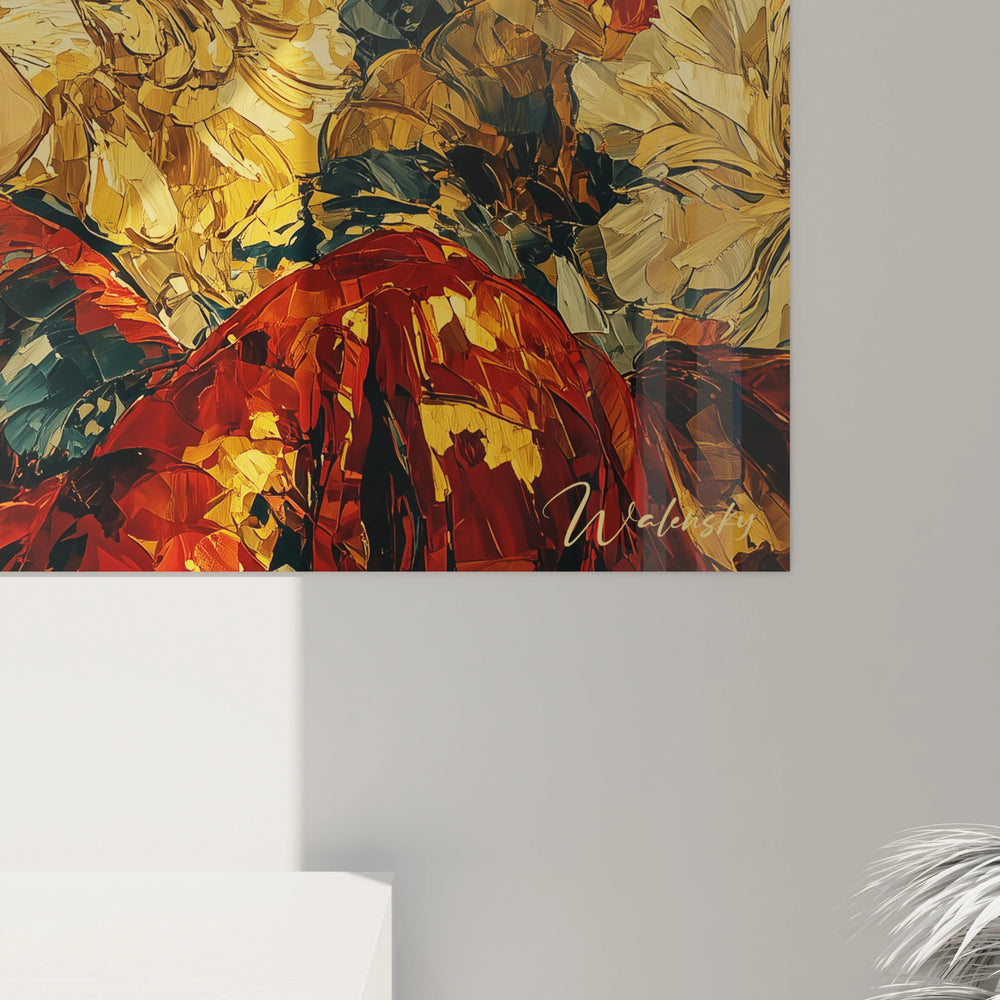 Cette œuvre d'art captivante présente une femme élégante aux cheveux bruns ondulés, mise en valeur par un tableau femme fleurs colorées d'une richesse visuelle exceptionnelle. La composition mélange harmonieusement le portrait féminin avec un environnement floral luxuriant, créant une décoration murale femme florale d'un impact saisissant. L'œuvre se distingue par sa palette chromatique audacieuse dominée par les rouges profonds, les oranges vibrants et les dorés chaleureux. Cette art mural femme jardin révèle une technique artistique sophistiquée où chaque pétale et chaque mèche de cheveux sont traités avec une précision remarquable, offrant une expérience visuelle immersive qui transforme l'espace.