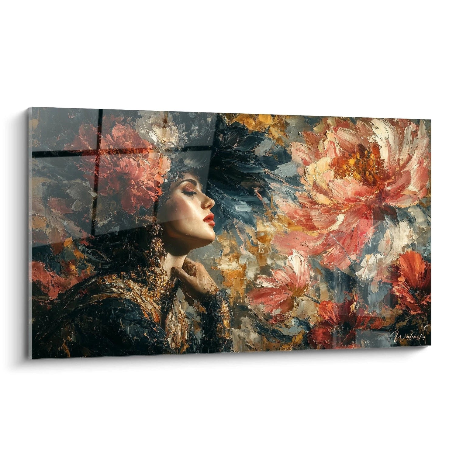 Cette œuvre femme se distingue par sa capacité à fusionner réalisme du portrait et abstraction florale dans une synthèse harmonieuse. L'expression contemplative de la femme, aux yeux mi-clos et aux lèvres entrouvertes, confère une dimension introspective rare. Les détails uniques incluent la façon dont les fleurs semblent littéralement émerger de la chevelure, créant une métamorphose poétique entre être humain et nature. Cette art mural romantique révèle des micro-détails dans les reflets nacrés de la peau et les variations chromatiques infinies des pétales, impossibles à reproduire mécaniquement.