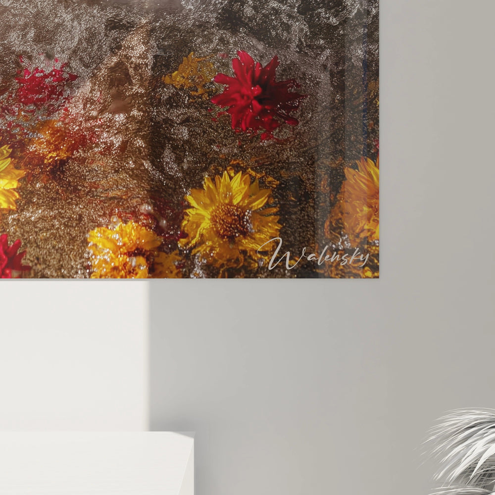 L'unicité de ce tableau femme fleurs d'eau réside dans plusieurs éléments distinctifs impossibles à reproduire. La présence des fleurs colorées flottant dans l'eau - tournesols jaunes éclatants et fleurs rouges intenses - apporte une dimension poétique et romantique à la scène. L'expression faciale du personnage, mélange parfait de sérénité et de sensualité, capture un instant d'émotion pure. Cette art mural femme moment suspendu fige un instant éphémère où l'eau semble danser autour du personnage central. La technique de rendu hyperréaliste des gouttelettes, chacune parfaitement formée et positionnée, témoigne d'une précision artistique remarquable qui différencie cette œuvre de toute autre création similaire.