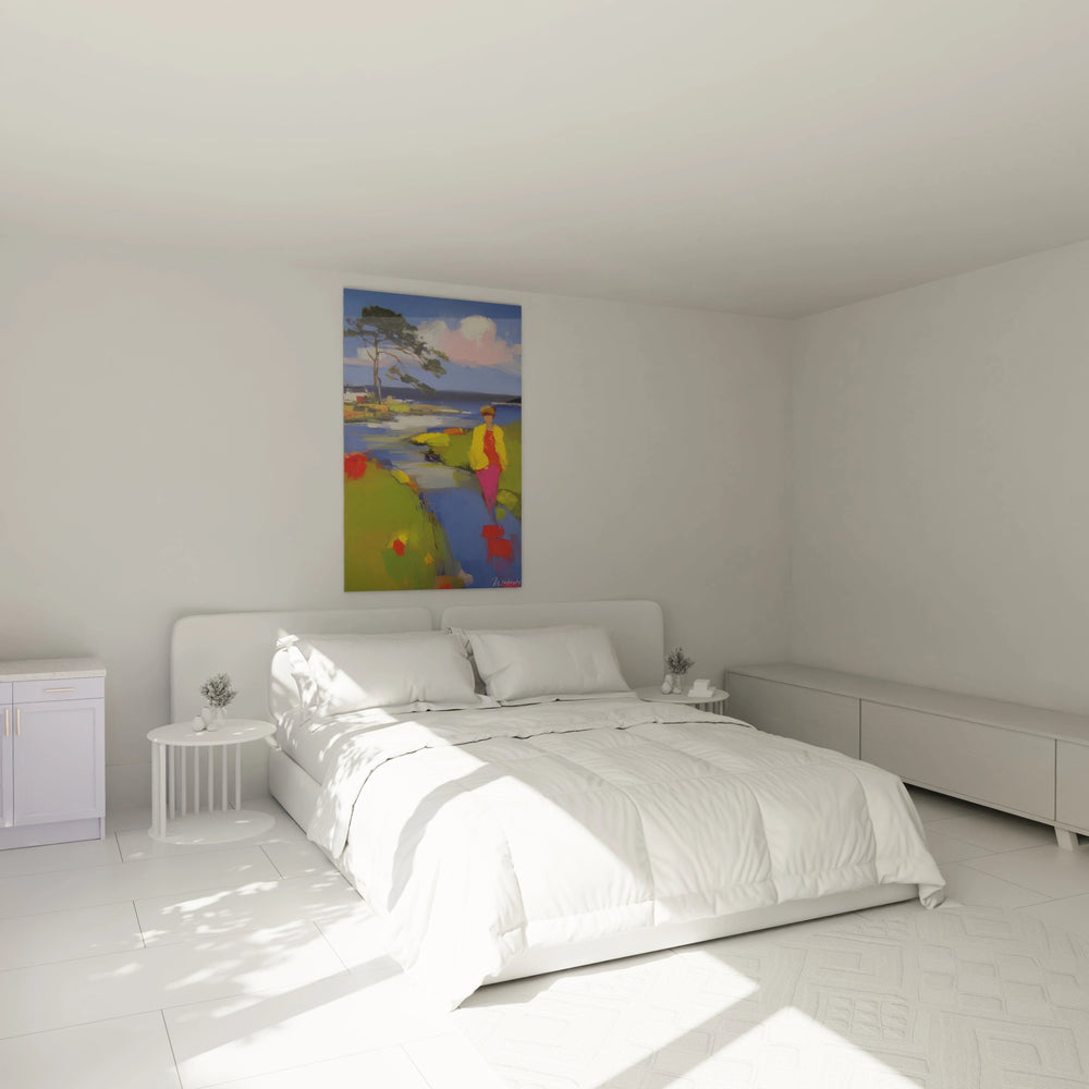 Ce tableau femme lumineux trouve sa place idéale dans des environnements qui peuvent accueillir et magnifier sa palette chromatique généreuse. Les intérieurs contemporains aux murs neutres (blanc, beige, gris clair) offrent un écrin parfait pour révéler l'intensité de ses couleurs. Un éclairage LED blanc chaud, orienté avec un angle de 30 degrés, permettra d'éviter les reflets tout en révélant les reliefs de la pâte picturale. Les espaces de vie comme le salon ou la salle à manger conviennent particulièrement, où cette œuvre peut dialoguer avec des textiles dans les tons complémentaires : coussins bleu marine, plaids ocre, ou accessoires dans les tons terre. L'association avec des matières naturelles comme le bois clair ou le rotin renforce l'aspect méditerranéen de cette composition, créant un ensemble décoratif harmonieux et accueillant.