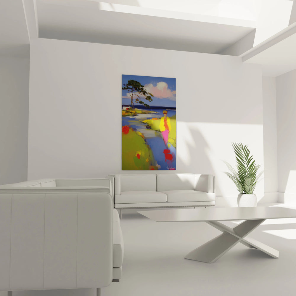 Ce tableau femme reflets se distingue par plusieurs éléments visuels remarquables qui en font une œuvre singulière. La gestuelle libre de l'artiste crée des effets de reflets dans l'eau d'une spontanéité saisissante, où les formes se décomposent et se recomposent selon les ondulations suggérées de la surface aquatique. L'association chromatique audacieuse entre le jaune vif du chemisier et le rose intense de la jupe confère à la figure une présence magnétique rare. L'arbre penché, avec sa silhouette caractéristique et son positionnement asymétrique, apporte une signature visuelle distinctive à cette décoration murale femme paysage. Les nuages aux formes généreuses et aux coloris nacrés créent un ciel théâtral qui enveloppe la scène d'une atmosphère particulière, impossible à reproduire à l'identique dans une autre composition.