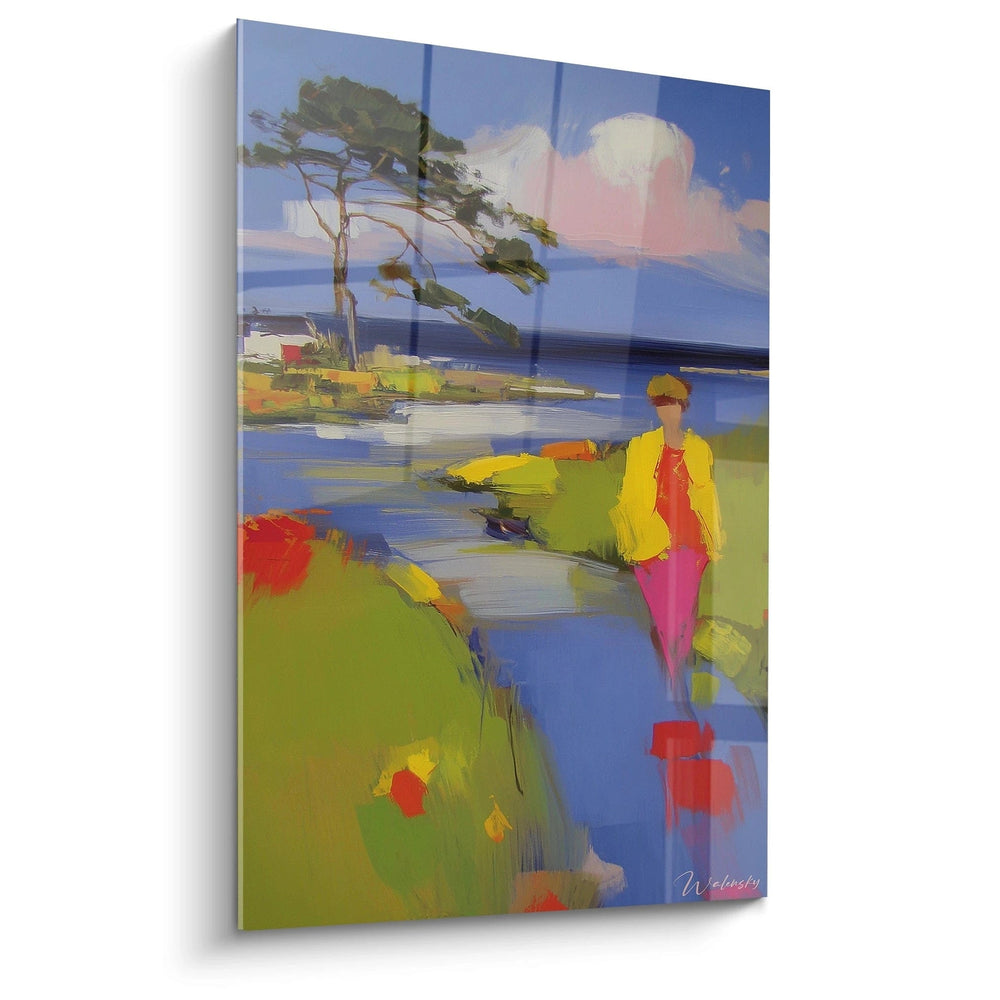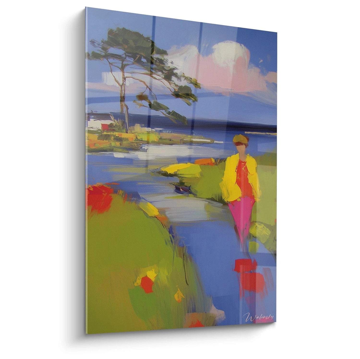 Ce tableau femme révèle une composition impressionniste contemporaine d'une remarquable intensité chromatique. La figure féminine, vêtue d'un ensemble jaune éclatant et d'une jupe rose vif, se dresse avec élégance au bord d'un cours d'eau aux reflets chatoyants. L'artiste a su créer un tableau femme paysage côtier où les couleurs saturées dialoguent harmonieusement avec les tons plus doux du ciel et des nuages. L'arbre penché sur la gauche, aux feuillages d'un vert profond, structure la composition en créant un contrepoint naturel à la verticalité de la silhouette féminine. Les reflets dans l'eau, traités par touches libres et spontanées, témoignent d'une approche picturale résolument moderne qui fait de ce tableau femme impressionniste moderne une œuvre captivante.