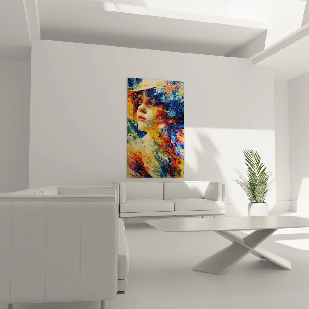 L'expérience visuelle de cette œuvre évolue considérablement selon la distance d'observation choisie. À distance rapprochée, les détails subtils du modelé facial révèlent la maîtrise technique de l'artiste, particulièrement visible dans le traitement des yeux et des lèvres. Cette tableau femme chapeau détaillé offre une richesse de lecture qui se renouvelle à chaque contemplation. L'examen attentif dévoile les nuances chromatiques les plus fines, notamment dans les zones de transition entre les couleurs. L'effet global à distance permet d'apprécier l'harmonie d'ensemble et l'impact émotionnel général de la composition. Cette œuvre femme moderne impressionnante récompense autant l'observation minutieuse que la contemplation d'ensemble, révélant différentes facettes selon l'approche choisie.
