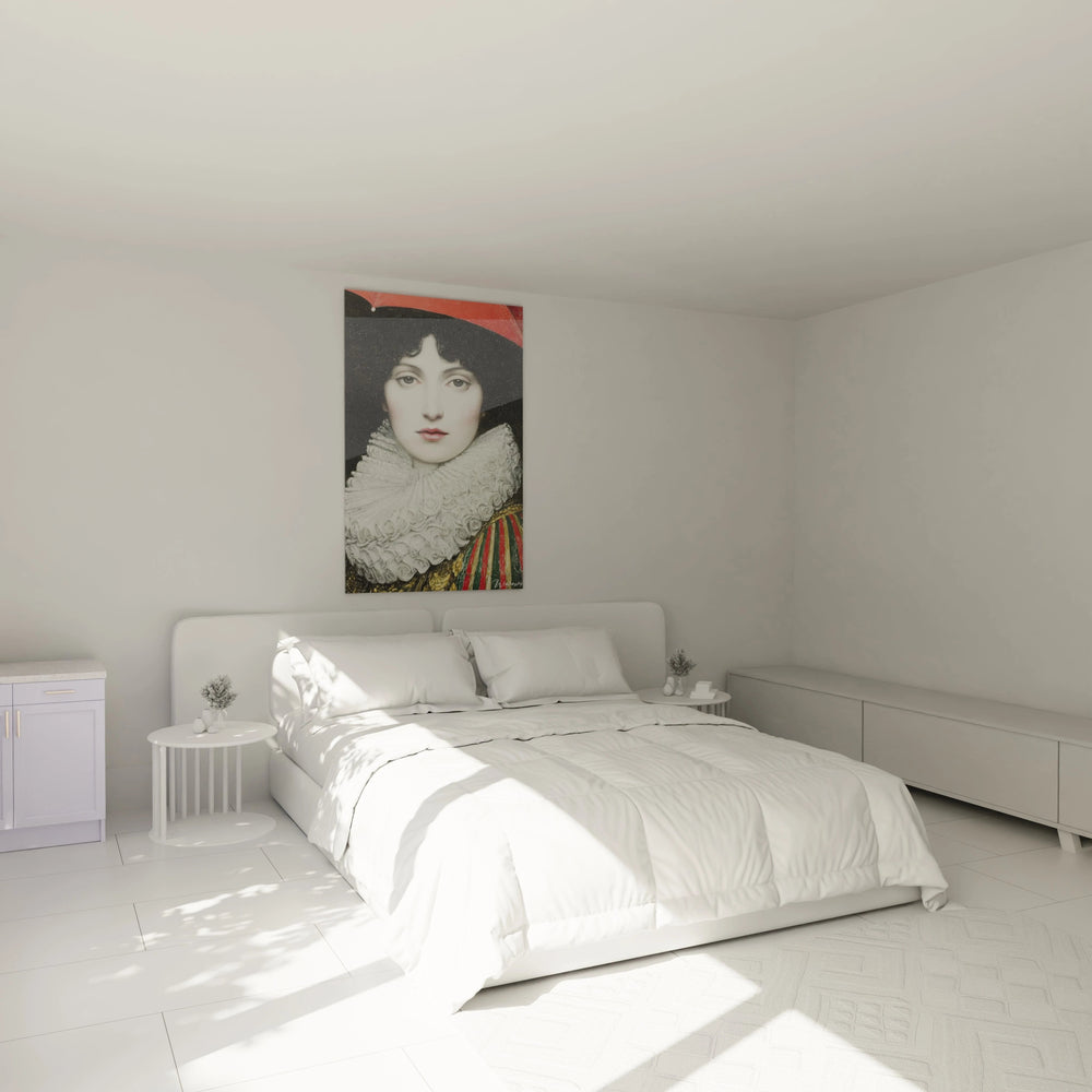 La composition de ce tableau femme parapluie vintage obéit à une géométrie parfaitement maîtrisée. Le visage occupe le centre exact de l'œuvre, créant un équilibre harmonieux renforcé par la symétrie de la collerette. Les lignes directrices convergent naturellement vers les yeux, point focal de l'ensemble. La perspective frontale privilégie l'intimité du regard, tandis que le cadrage rapproché intensifie la présence du personnage. L'art mural femme parapluie exploite habilement l'espace disponible, le parapluie rouge créant un dais protecteur au-dessus du personnage. Les proportions respectent les canons classiques du portrait, avec un rapport tête-épaules parfaitement équilibré qui confère une prestance naturelle au sujet.