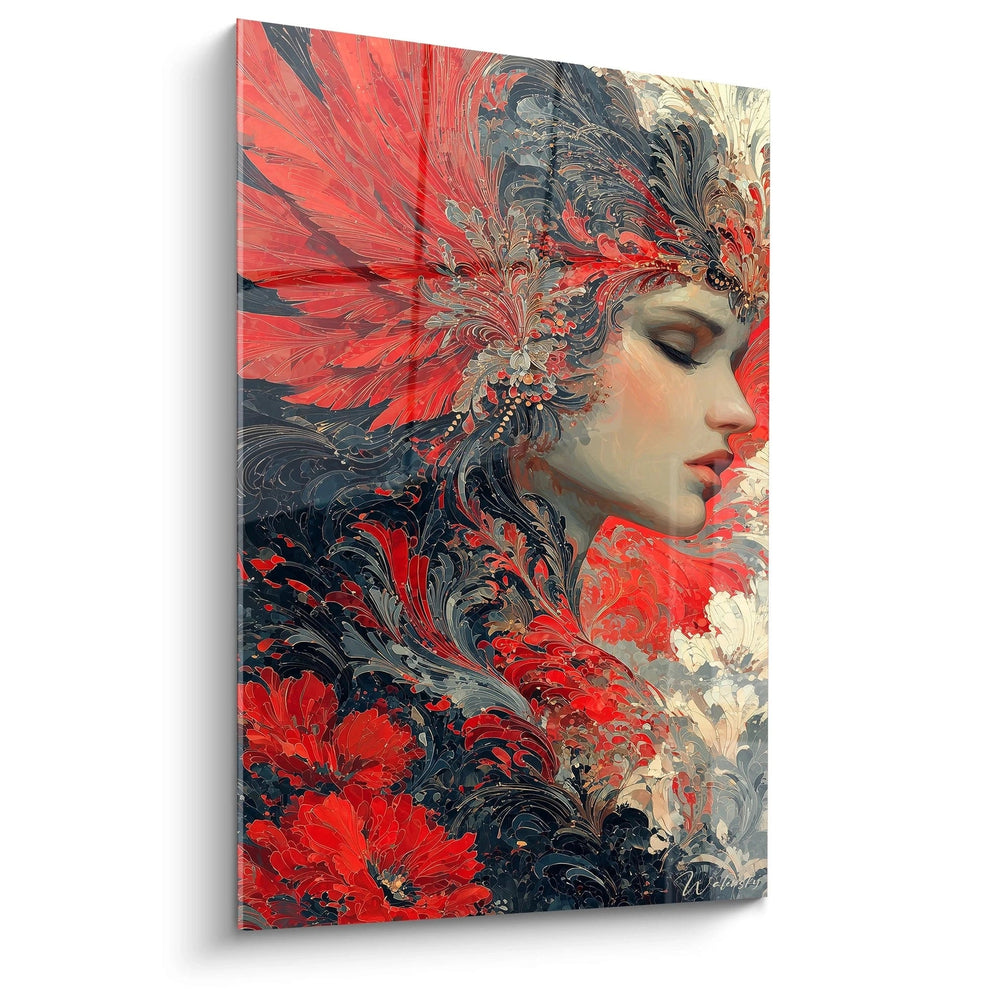 Cette décoration murale rouge baroque utilise les contrastes chromatiques pour créer une profondeur remarquable. L'impact émotionnel des couleurs choisies évoque une passion intense et une élégance mystérieuse, caractéristiques qui font de ce tableau femme couleurs vibrantes une pièce d'exception pour tout amateur d'art sophistiqué.
