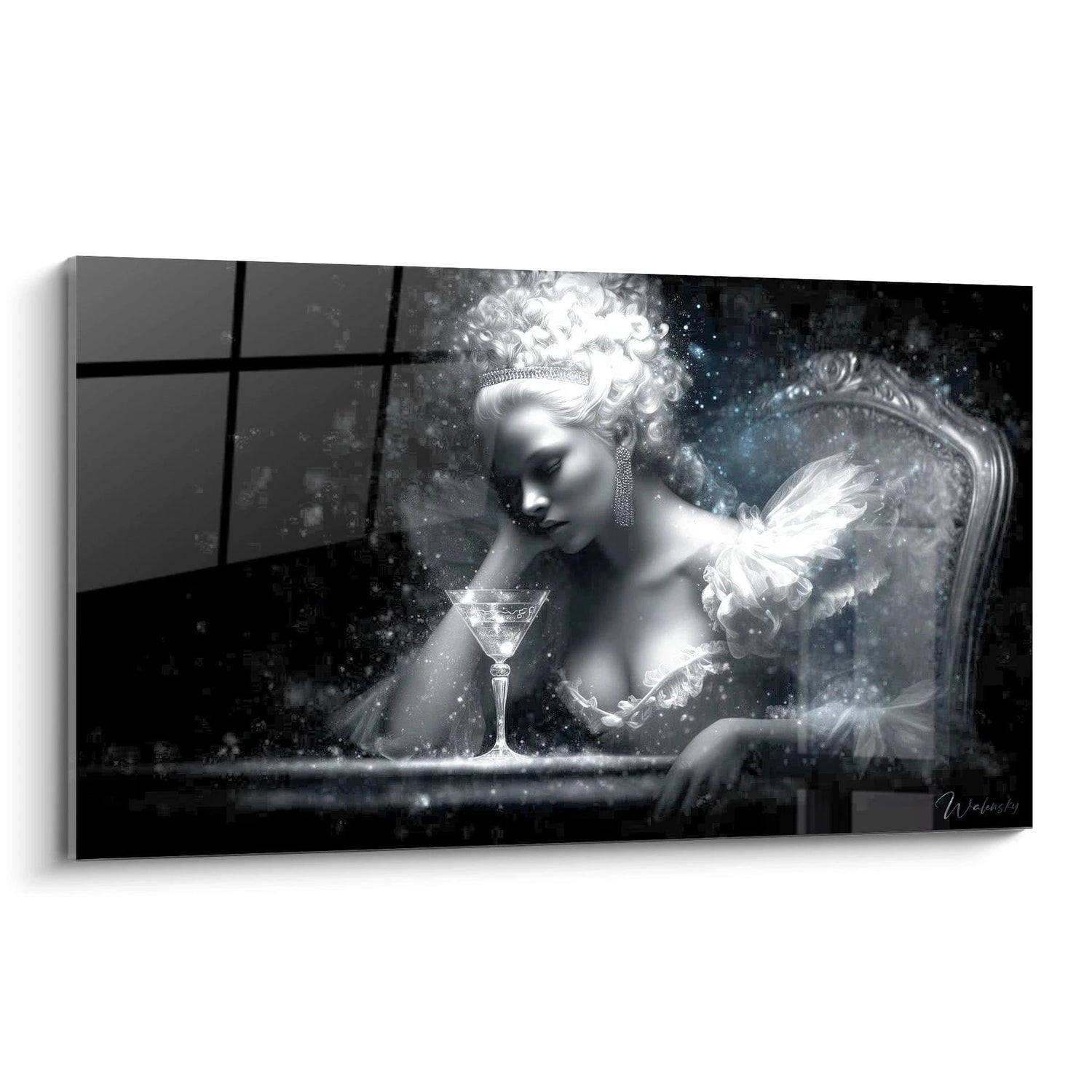 Cette œuvre d'art captivante présente une femme élégante dans un univers cosmique enchanteur. Le tableau femme révèle un personnage féminin gracieux tenant délicatement un verre de champagne, baignant dans une atmosphère étoilée mystérieuse. La composition allie sophistication classique et modernité artistique, créant un tableau femme champagne cosmique d'une rare beauté. L'artiste a su capturer l'essence de l'élégance féminine en l'associant à un décor stellaire fascinant, où chaque détail contribue à l'harmonie générale de cette décoration murale femme élégante exceptionnelle.