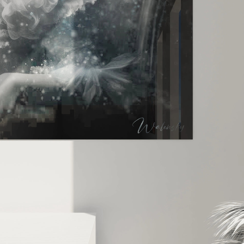 L'unicité de cette œuvre réside dans sa capacité à transcender les genres artistiques traditionnels. La fusion entre portrait classique et imagerie cosmique crée un style distinctif impossible à reproduire. Les détails uniques incluent la coiffure élaborée ornée de bijoux scintillants, la position gracieuse de la main tenant le verre, et l'expression contemplative du visage. L'arrière-plan stellaire n'est pas simplement décoratif mais participe à la narration visuelle, suggérant une dimension spirituelle ou métaphysique. Les proportions idéalisées du personnage évoquent les maîtres de la Renaissance tout en s'inscrivant dans une esthétique résolument contemporaine. Cette art mural femme avant-gardiste établit un nouveau paradigme artistique où tradition et innovation se rencontrent harmonieusement.
