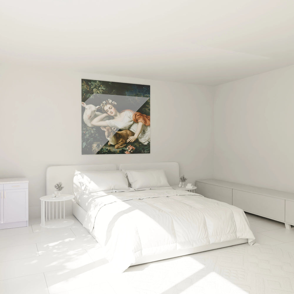 L'originalité de cette œuvre réside dans sa capacité à fusionner humanité et animalité dans une communion parfaite. Le tableau femme vache symbolisme transcende la simple représentation pour atteindre une dimension allégorique profonde. La gestuelle protectrice envers les animaux évoque les vertus maternelles idéalisées par l'art néoclassique. Les fleurs blanches couronnant la chevelure établissent un dialogue poétique avec le pelage immaculé de la vache, créant une unité chromatique et symbolique remarquable. Cette art mural femme animaux se distingue par sa narration silencieuse, où chaque élément contribue à une histoire visuelle cohérente. L'expression sereine du visage féminin contraste avec la vivacité attentive des regards animaux, créant une tension dramatique subtile mais perceptible.