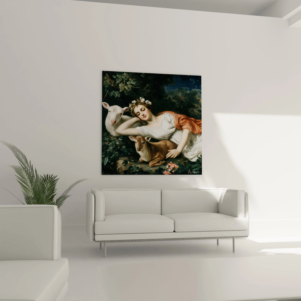 Cette œuvre d'art présente une femme en robe blanche dans une scène pastorale empreinte de sérénité. Le tableau femme bucolique révèle une composition harmonieuse où la figure féminine occupe le centre, accompagnée d'une vache blanche et d'un veau brun. Les fleurs blanches ornant sa chevelure créent un lien visuel avec l'animal, tandis que sa posture allongée évoque la grâce antique. Cette décoration murale femme nature capture l'essence de l'idéal néoclassique à travers ses lignes pures et sa palette chromatique raffinée. L'expression paisible du visage féminin et la douceur de ses gestes transmettent une atmosphère de quiétude absolue, caractéristique des maîtres de cette époque.