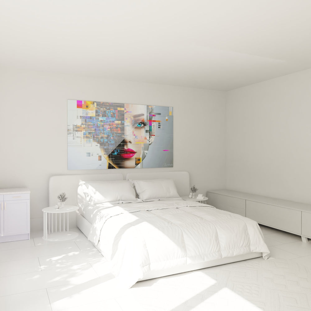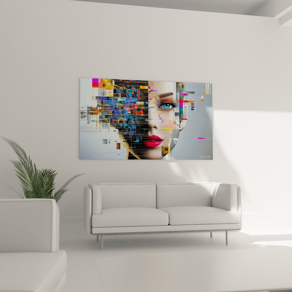 Ce tableau mural femme digitale présente une œuvre d'art moderne abstrait saisissante où la beauté féminine se mêle à l'univers technologique contemporain. Le visage de cette femme aux yeux bleus perçants émerge d'un chaos digital coloré, créant une composition artistique fragmentée d'une rare intensité. Les pixels multicolores se dispersent autour du portrait, évoquant la désintégration et la recomposition numérique de l'identité moderne. Cette œuvre d'art contemporain capture parfaitement l'essence de notre époque digitale, où l'humain et la technologie fusionnent dans une danse visuelle fascinante. Le tableau décoratif moderne révèle des détails minutieux : lèvres rouge vif qui contrastent avec la fragmentation environnante, regard hypnotique qui transperce le spectateur, et une esthétique futuriste qui transforme le portrait classique en manifeste technologique. Cette peinture numérique artistique questionne notre rapport à l'image et à l'identité dans l'ère du numérique, offrant une réflexion profonde sur la condition humaine contemporaine à travers une représentation visuelle innovante.