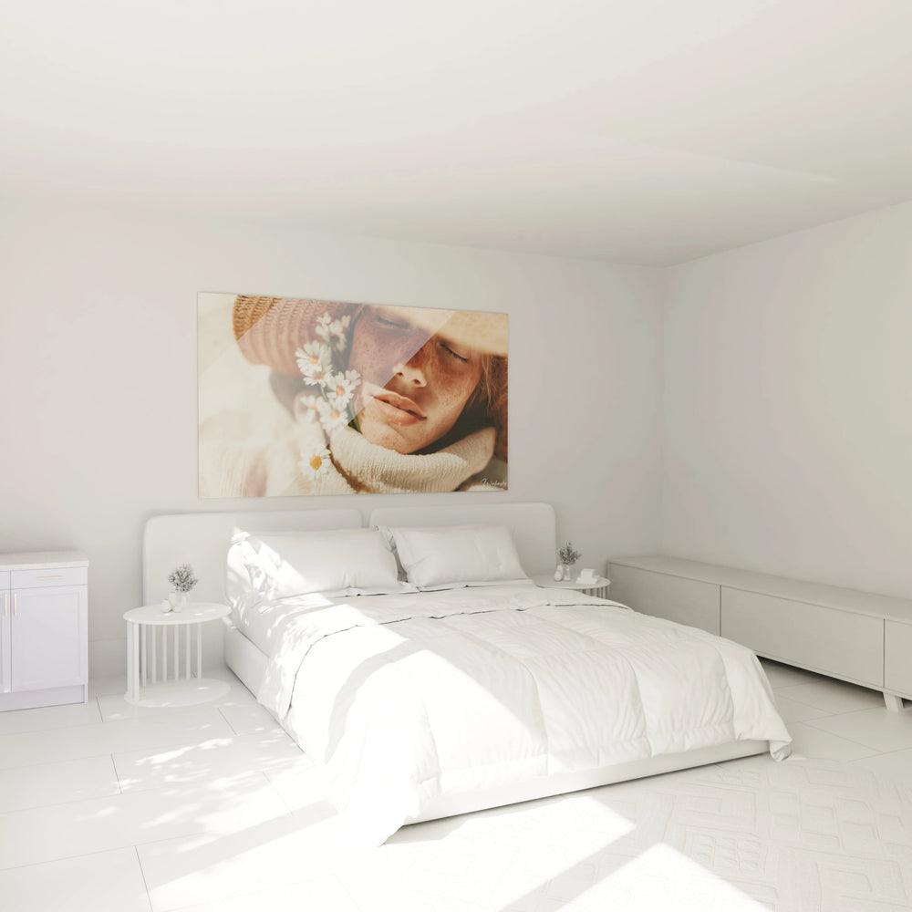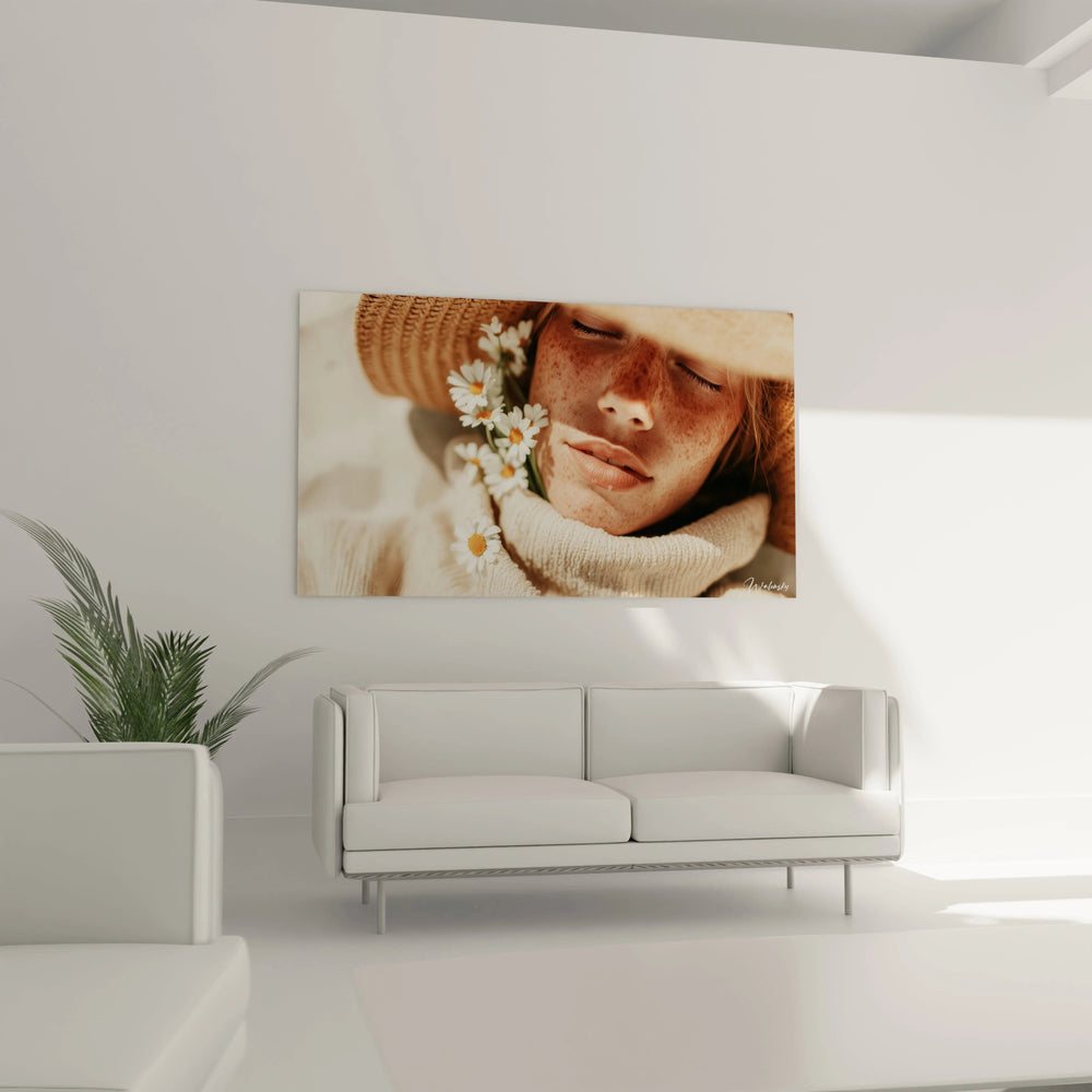 Ce tableau femme marguerites se distingue par son approche authentique de la beauté naturelle. Les détails uniques incluent la disposition spontanée des marguerites qui semblent naturellement placées, les taches de rousseur qui créent un caractère distinctif, et l'expression paisible des yeux fermés qui transmet une émotion pure. La technique de tressage des cheveux apporte une dimension artisanale à l'ensemble. Les caractéristiques spécifiques de cette décoration murale femme marguerites naturelle résident dans sa capacité à capturer un moment d'intimité sans artifice. L'aspect visuel remarquable tient à cette harmonie parfaite entre simplicité et raffinement, créant une œuvre impossible à reproduire dans sa spontanéité émotionnelle.