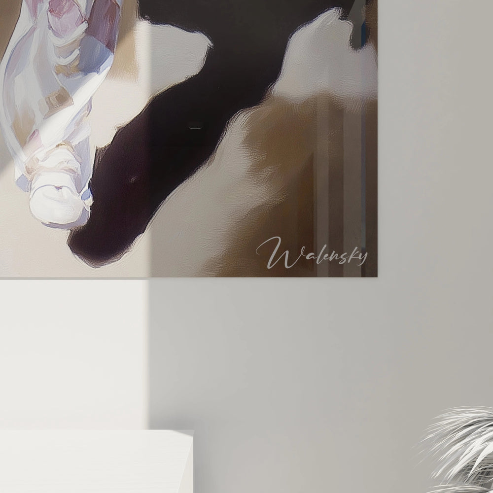 La composition de ce tableau femme blanc élégant suit une structure verticale parfaitement équilibrée. Le personnage principal est positionné au centre, créant un axe de symétrie naturel qui guide le regard vers son visage expressif. Les lignes directrices convergent vers la silhouette, renforcées par l'ombre projetée qui ancre visuellement l'ensemble dans l'espace. La perspective frontale permet une connexion directe avec le spectateur, tandis que l'arrière-plan flou crée une profondeur subtile. Cette œuvre femme blanc utilise intelligemment l'espace négatif pour mettre en valeur le sujet principal, créant un équilibre parfait entre zones occupées et zones de respiration visuelle.