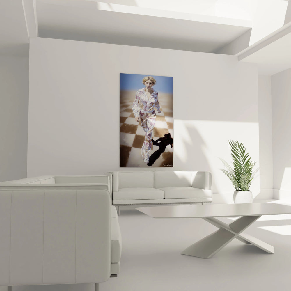 Ce tableau femme blanc révèle une œuvre d'une intensité visuelle remarquable où une jeune femme aux cheveux blonds ondulés occupe le centre de la composition. Vêtue d'un ensemble blanc immaculé composé d'une chemise et d'un pantalon, elle se détache avec une présence saisissante sur un arrière-plan aux tons ocre et beige. Le tableau femme blanc lumineux capture un moment de mouvement gracieux, la silhouette projetant une ombre noire contrastante au premier plan. L'expression sereine du visage et la posture confiante créent une harmonie parfaite entre modernité et intemporalité, faisant de cette décoration murale femme blanc une pièce d'exception.