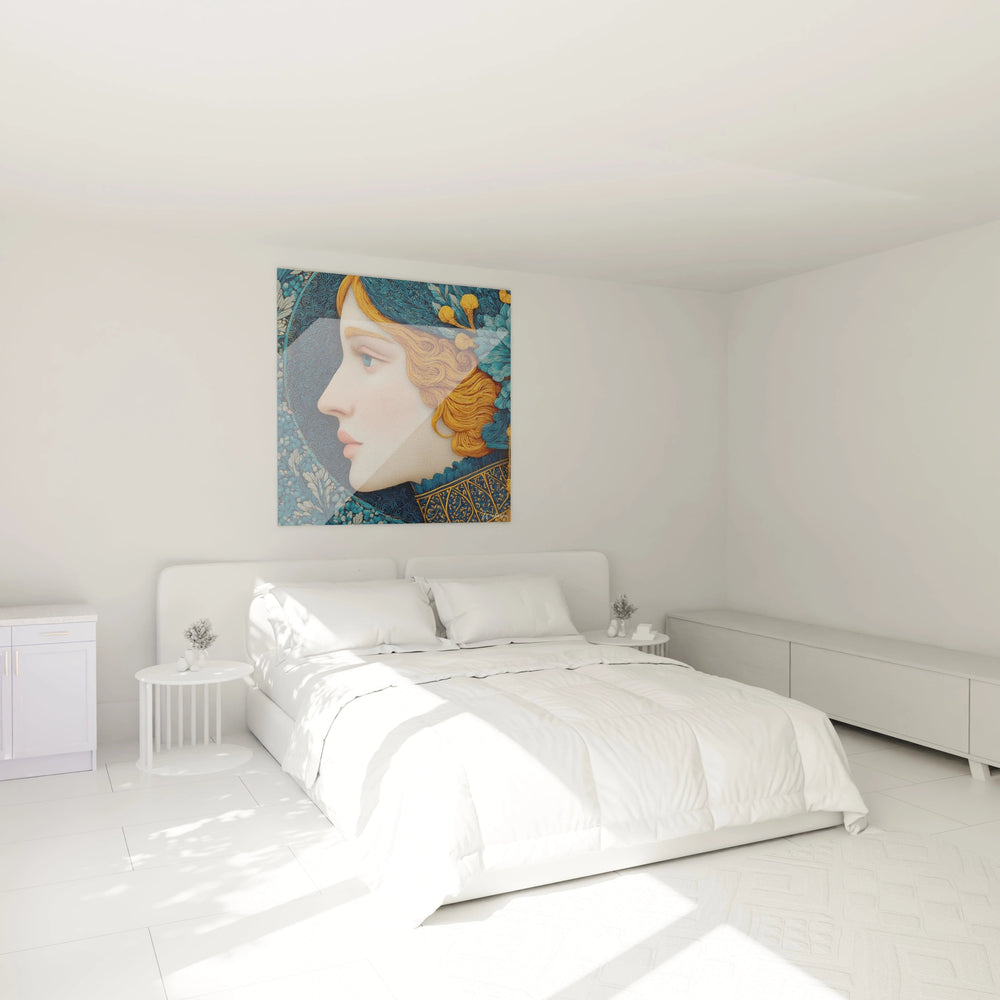 L'examen des textures révèle un travail d'une précision remarquable dans ce tableau femme technique décorative. Les surfaces présentent des variations subtiles qui enrichissent l'expérience visuelle. La chevelure dorée arbore des ondulations fluides qui semblent animées d'un mouvement perpétuel, tandis que les ornements métalliques brillent d'un éclat mat sophistiqué. Les effets de lumière et d'ombre créent une profondeur tridimensionnelle qui donne vie aux motifs floraux et géométriques. La technique artistique identifiable emprunte aux traditions de l'enluminure par sa minutie et aux arts décoratifs par sa richesse ornementale. Cette décoration murale femme précieuse maintient une cohérence technique qui unifie l'ensemble malgré la complexité des détails.