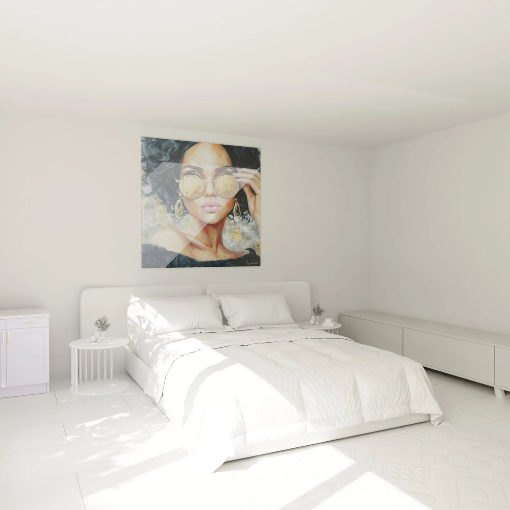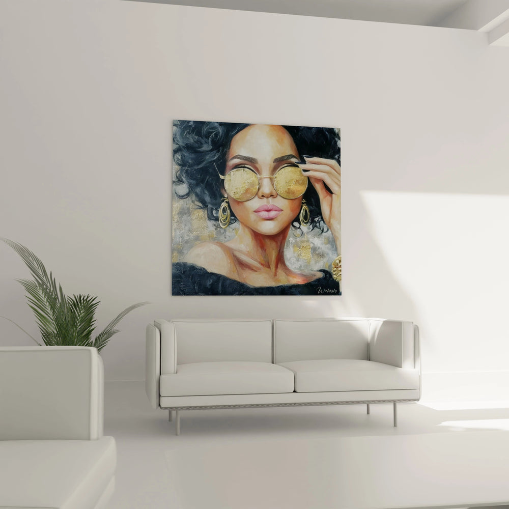 Ce tableau mural femme représente une femme moderne incarnant l'élégance et le mystère contemporain. L'artiste a créé un portrait féminin moderne saisissant où dominent les lunettes de soleil dorées aux verres réfléchissants, véritable signature de cette œuvre. Ces lunettes ne sont pas qu'un simple accessoire, elles deviennent le symbole d'une féminité glamour assumée et mystérieuse, protégeant le regard tout en révélant la personnalité forte du sujet.