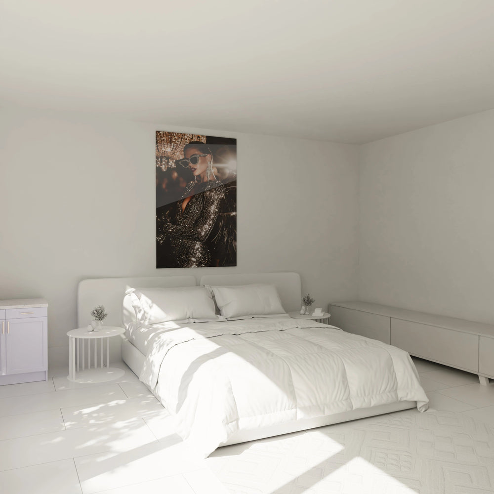 Cette création s'inscrit dans la lignée des portraits glamour d'Andy Warhol et de l'esthétique Art Déco des années 1920. L'influence de la photographie de mode contemporaine de Mario Testino ou de Steven Meisel transparaît dans le traitement de la lumière. L'œuvre rappelle également les portraits de stars hollywoodiennes des studios Harcourt, avec cette maîtrise du clair-obscur et cette sophistication intemporelle. Cette fusion d'influences crée une œuvre unique qui dialogue avec l'histoire de l'art tout en affirmant sa modernité.
