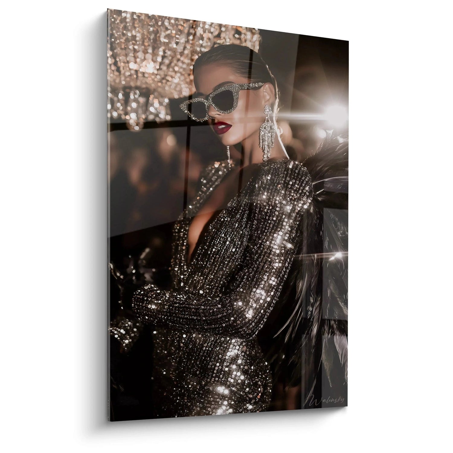 Ce tableau mural haute couture capture l'essence du glamour féminin contemporain à travers le portrait d'une femme d'une élégance saisissante. L'œuvre met en scène une silhouette sophistiquée vêtue d'une robe entièrement ornée de sequins argentés qui créent un jeu de reflets hypnotisant. Chaque paillette capture et renvoie la lumière ambiante, transformant la toile en une surface chatoyante qui évoque les plus prestigieuses soirées parisiennes. Les lunettes de soleil incrustées de cristaux ajoutent une dimension mystérieuse au personnage, tandis que ses lèvres rouge carmin apportent une touche de sensualité classique. Les boucles d'oreilles cascades en diamants complètent cette parure luxueuse, créant un ensemble harmonieux qui respire la mode de luxe. L'arrière-plan présente un lustre cristallin aux multiples facettes, symbole du raffinement et du luxe parisien. Cette installation lumineuse diffuse une lumière dorée qui sublime l'ensemble de la composition, créant une atmosphère feutrée et exclusive. Les plumes noires qui ornent la tenue apportent un contraste dramatique et renforcent l'aspect théâtral de l'ensemble. Cette œuvre d'art murale transforme n'importe quel espace en galerie d'art contemporain, apportant une touche de sophistication inégalée.
