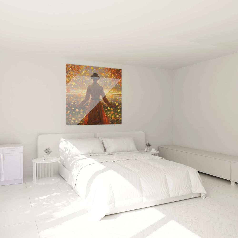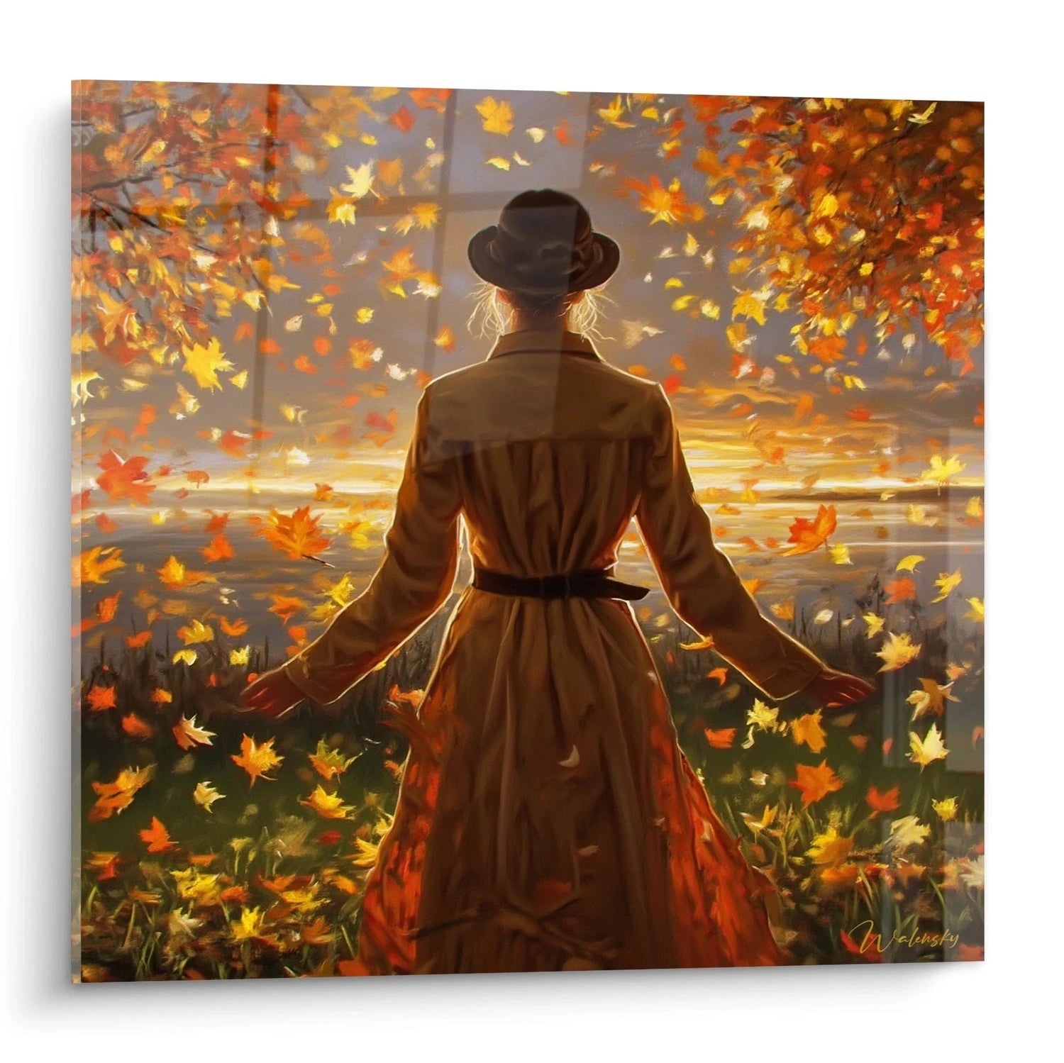 Ce tableau femme captive par sa représentation saisissante d'une silhouette féminine contemplant un paysage automnal spectaculaire. La composition révèle une femme élégante portant un manteau brun et un chapeau noir, vue de dos dans une posture contemplative. Les feuilles d'érable tourbillonnent autour d'elle dans une danse colorée, créant une atmosphère magique et poétique. Ce tableau femme automne doré se distingue par son traitement lumineux exceptionnel, où chaque feuille semble illuminée par une lumière chaude et dorée. L'artiste a su créer une œuvre où la figure humaine s'intègre parfaitement dans l'environnement naturel, offrant une vision romantique et contemplative de la saison automnale.
