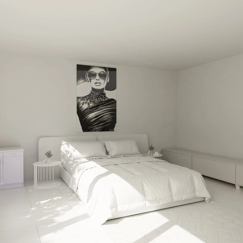Ce tableau mural illustration mode présente une femme élégante dans un style graphique contemporain. L'œuvre se distingue par son traitement artistique en noir et blanc, créant un contraste saisissant qui captive immédiatement le regard. La protagoniste arbore de grandes lunettes de soleil rondes qui constituent l'élément central de la composition, conférant une aura mystérieuse et glamour à l'ensemble. Ses cheveux sont coiffés en un chignon structuré, témoignant d'un raffinement typique des codes esthétiques de la haute couture.