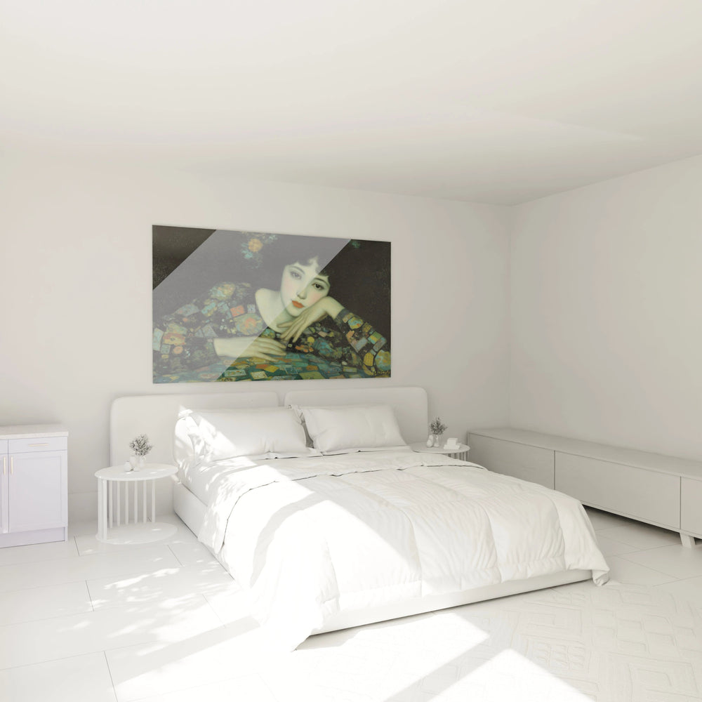 Observé de près, ce tableau femme détails précieux révèle une multitude d'éléments qui échappent au regard distant. Chaque motif géométrique présente des variations subtiles de couleur et de texture. Les cils délicatement tracés, les nuances d'ombre sur les joues, la courbe précise des lèvres témoignent d'un travail minutieux. À distance, l'effet d'ensemble domine, créant une impression de richesse décorative générale. Cette dualité de lecture fait de cette art mural femme sophistiqué une œuvre qui se renouvelle selon l'angle d'observation. Les reflets changeants sur les motifs colorés créent une dynamique visuelle qui évolue avec l'éclairage ambiant.