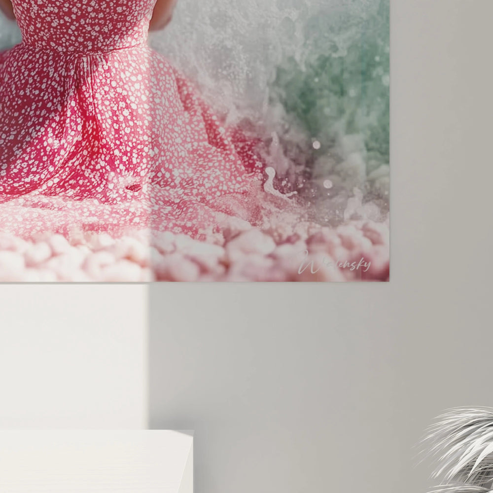 Les textures visibles dans cette œuvre femme robe fleurie océan révèlent une attention particulière aux détails matériels. Le chapeau de paille présente un tressage circulaire finement rendu, créant des jeux d'ombre et de lumière subtils. La robe dévoile une surface textile fluide ornée de petits motifs floraux blancs délicatement dispersés sur le fond rouge. L'eau manifeste différents états texturaux : lisse et réfléchissante dans les zones calmes, écumeuse et dynamique là où les vagues se brisent. Les reflets lumineux dansent sur la surface marine, créant des points de brillance qui accentuent le réalisme de cette art mural femme texture aquatique. La technique révèle une maîtrise des contrastes entre les matières douces du textile et la fluidité cristalline de l'élément marin.
