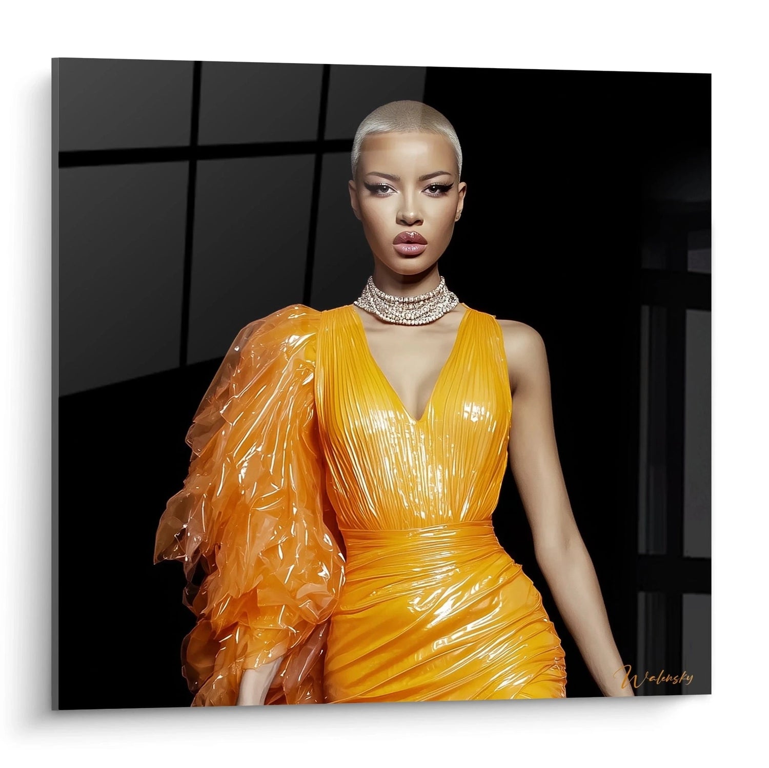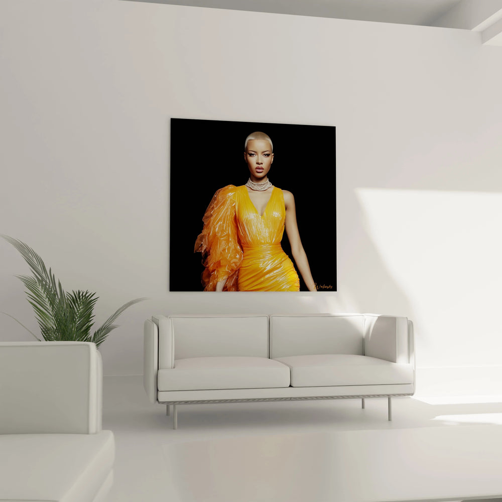 La palette chromatique de cette œuvre haute couture révèle une symbolique riche et intentionnelle. Le jaune orangé éclatant de la robe dorée glamour évoque la créativité, l'énergie vitale et l'optimisme, tandis que ses reflets dorés suggèrent le luxe, la préciosité et l'excellence. Cette teinte chaleureuse contraste dramatiquement avec le fond noir profond, créant une tension visuelle contemporaine qui symbolise l'émergence de la beauté depuis l'obscurité. Le platine des cheveux, couleur de la modernité et innovation esthétique, renforce l'aspect futuriste de l'ensemble. Cette harmonie colorielle traduit une vision contemporaine de l'élégance où tradition et avant-garde se rencontrent.