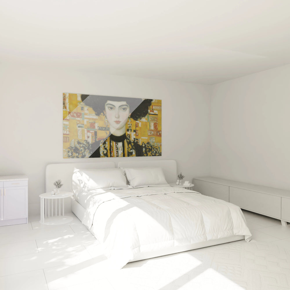 Cette décoration murale portrait femme ambiance sophistiquée s'intègre parfaitement dans des environnements raffinés aux tons neutres ou dorés. Un éclairage LED blanc chaud révélera pleinement les nuances dorées de l'arrière-plan sans altérer les contrastes. Les murs beiges, crème ou gris anthracite formeront un écrin idéal pour cette œuvre. Dans un salon contemporain, elle apportera une touche d'élégance classique, tandis qu'en chambre, elle créera une atmosphère intime et contemplative. Cette œuvre portrait femme décoration intérieure s'harmonise particulièrement bien avec des meubles aux finitions dorées, du mobilier en bois sombre ou des textiles aux tons chauds qui rappelleront les ors de l'arrière-plan.