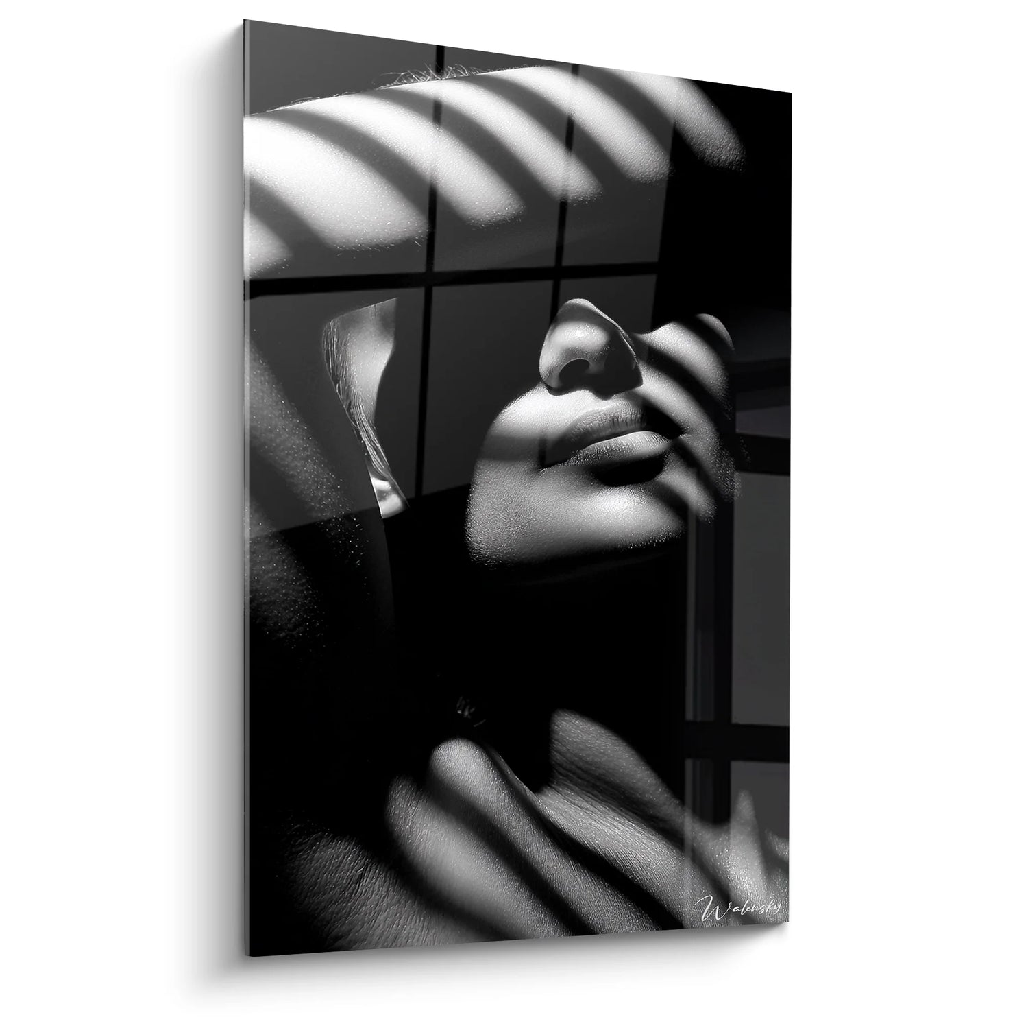 Ce tableau femme noir et blanc capture un moment d'une beauté saisissante où la lumière naturelle sculpte délicatement les traits d'un visage féminin. L'art mural moderne présenté ici révèle une femme baignée par les ombres géométriques projetées par une fenêtre, créant un jeu de clair-obscur d'une intensité remarquable. Les rayons lumineux dessinent des bandes parallèles sur la peau, transformant ce portrait artistique en une véritable symphonie visuelle. La composition photographique met en valeur la sensualité et la grâce naturelle du modèle, dont le regard dirigé vers la source lumineuse évoque la contemplation et l'introspection. Ce tableau XXL moderne s'inscrit parfaitement dans la tradition de la photographie d'art contemporaine, où chaque détail compte pour créer une émotion pure. La décoration murale sophistiquée qu'offre cette œuvre transforme instantanément l'atmosphère d'un espace de vie, apportant une dimension artistique et poétique incomparable.
