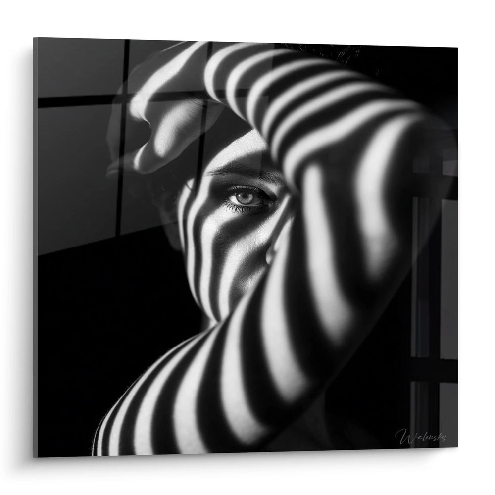 Ce tableau portrait femme noir et blanc présente une composition artistique saisissante où les jeux d'ombres et de lumière créent une atmosphère mystérieuse et captivante. L'œuvre met en scène un visage féminin partiellement masqué par des bandes d'ombres géométriques qui traversent harmonieusement ses traits délicats. L'œil visible, d'une intensité remarquable, devient le point focal de cette photographie artistique noir et blanc, transmettant une émotion profonde et une présence magnétique. Les contrastes marqués entre les zones éclairées et les parties sombres confèrent à ce tableau décoratif moderne une dimension sculpturale exceptionnelle. La technique photographique employée révèle une maîtrise parfaite des effets de clair-obscur, rappelant les grands maîtres de la photographie contemporaine. Cette décoration murale élégante s'inscrit parfaitement dans les tendances actuelles de l'art mural, offrant une pièce de caractère qui transforme instantanément l'ambiance d'un intérieur. La composition soignée et l'esthétique raffinée font de ce tableau XXL visage artistique un choix idéal pour les amateurs d'art photographique et de décoration sophistiquée.