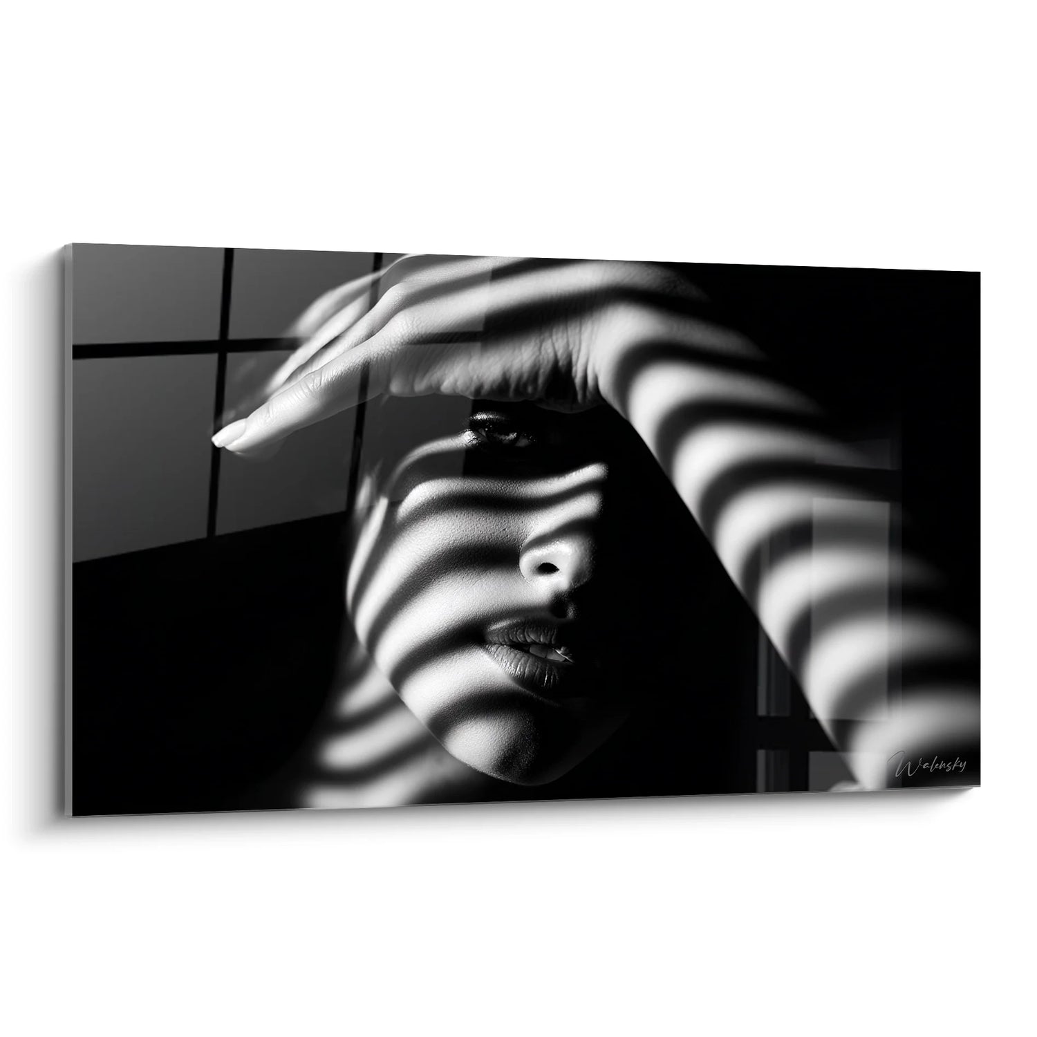 Ce tableau femme noir et blanc présente un portrait saisissant où les ombres striées créent un effet visuel hypnotique sur le visage de la modèle. L'œuvre capture un moment contemplatif, la main délicatement posée près du visage dans une gestuelle gracieuse et introspective. Les lignes d'ombre parallèles qui traversent l'ensemble de la composition transforment ce portrait artistique noir et blanc en une véritable exploration de la lumière et de l'obscurité. La photographie artistique monochrome révèle chaque détail avec une précision remarquable, des textures de la peau aux expressions subtiles du regard. Ce tableau moderne femme s'inscrit dans la tradition du portrait contemporain où la technique photographique rencontre l'art décoratif. L'artiste a magistralement utilisé l'éclairage dramatique noir et blanc pour créer une atmosphère à la fois mystérieuse et élégante, faisant de cette œuvre un choix parfait pour une décoration murale sophistiquée.