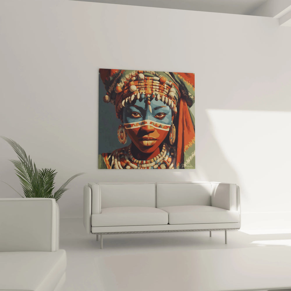 Ce tableau femme africaine révèle immédiatement sa singularité par la représentation majestueuse d'un visage féminin aux traits délicats, orné d'une parure traditionnelle exceptionnelle. L'œuvre se distingue par un tableau femme africaine masquée où la peau bleutée contraste harmonieusement avec les tons chauds des ornements. Les cauris blancs qui parent la coiffure et les colliers de perles créent un effet visuel saisissant, transformant cette décoration murale femme africaine en véritable hymne à la beauté ancestrale. Le masque facial géométrique aux motifs tribaux rouges et blancs apporte une dimension mystique incomparable, faisant de cette œuvre femme africaine un témoignage artistique authentique de la richesse culturelle africaine.