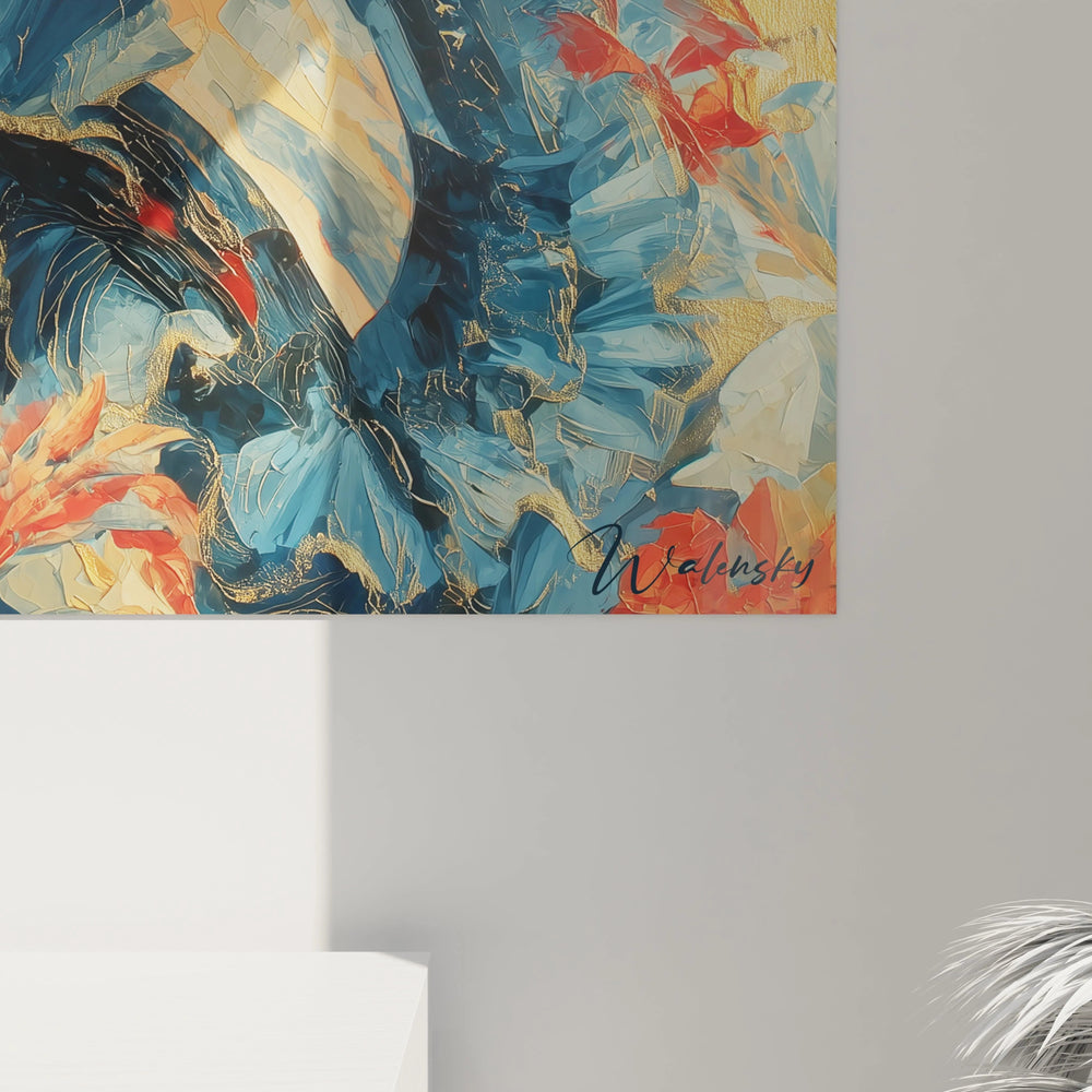La palette chromatique de cette art mural femme révèle une maîtrise exceptionnelle des contrastes complémentaires. Les bleus profonds, déclinés du cobalt au bleu de Prusse, s'opposent magistralement aux rouges vermillon et aux oranges cuivrés qui embrasent certaines zones de la composition.