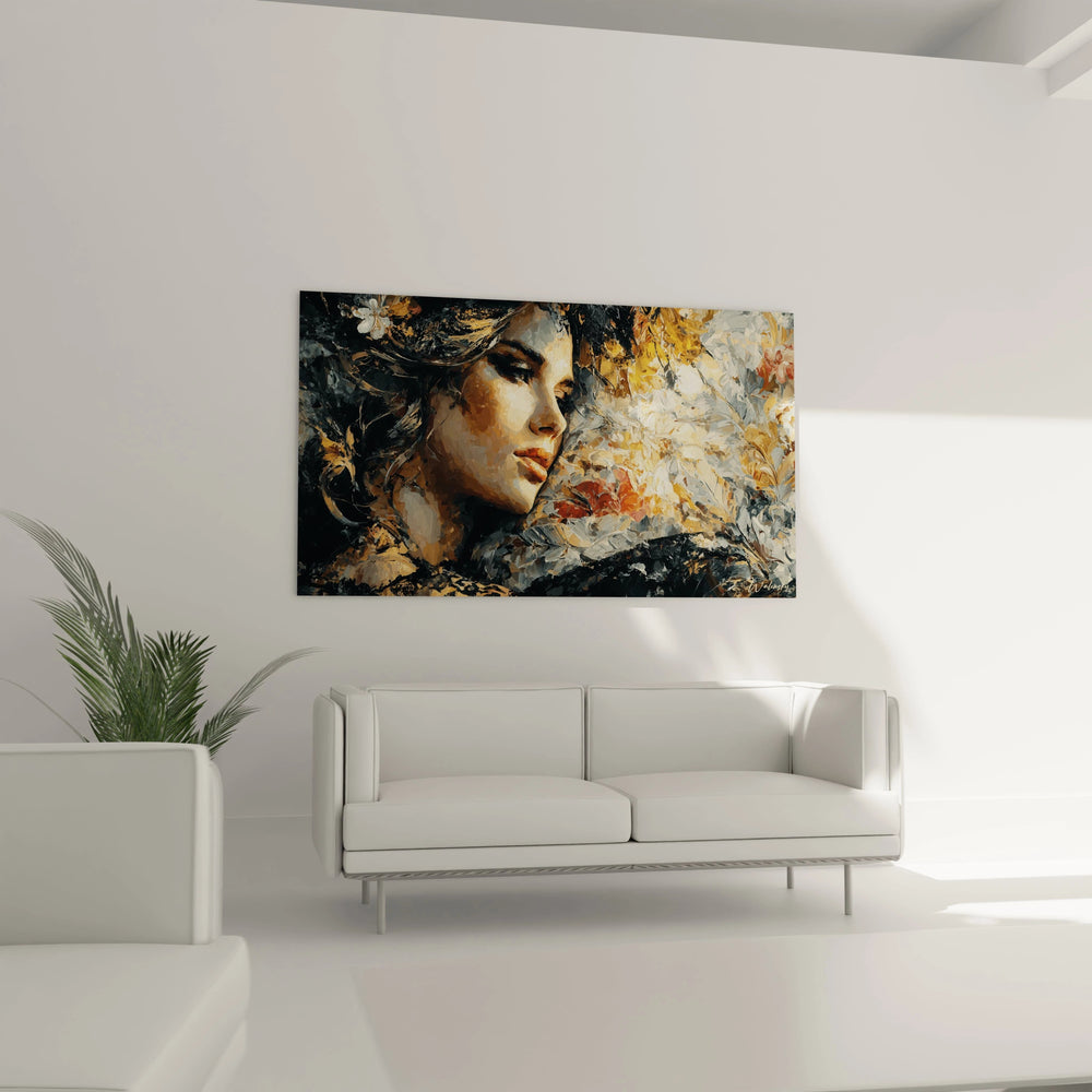 Ce tableau femme fleurs présente un portrait saisissant où une femme au profil délicat se trouve immergée dans un univers floral luxuriant. L'œuvre révèle immédiatement une décoration murale femme fleurs d'une richesse visuelle exceptionnelle, où les pétales dorés et orangés encadrent harmonieusement le visage féminin. La technique picturale employée crée une texture particulièrement dense, donnant à ce tableau femme portrait floral une profondeur remarquable. Les tons chauds dominent la composition, créant une atmosphère intimiste et contemplative qui distingue cette œuvre d'art unique.