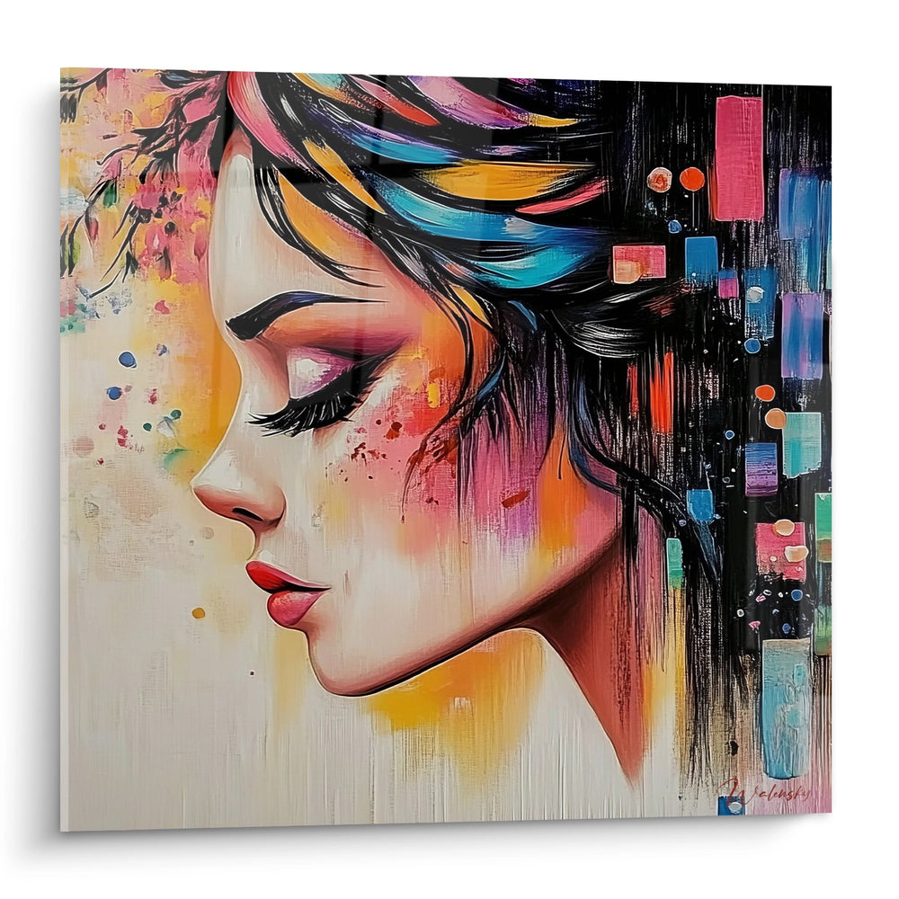 Tags : tableau femme profil, art abstrait moderne, peinture portrait coloré, décoration murale femme, art contemporain visage