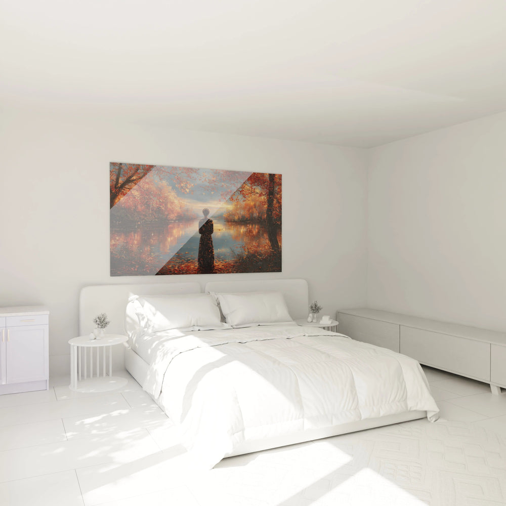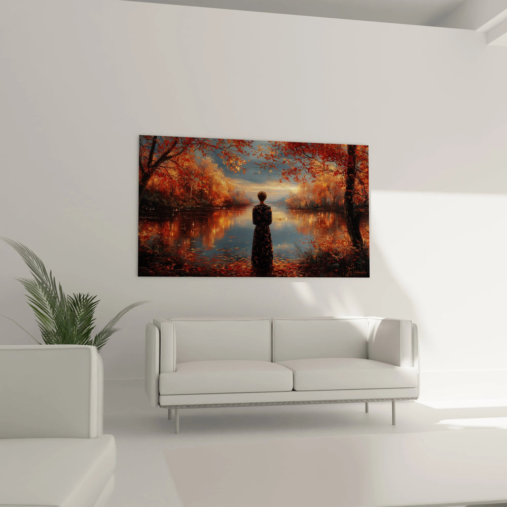 Ce tableau femme contemplative présente une scène d'une beauté saisissante où une silhouette féminine se dresse face à un lac miroir entouré d'une forêt aux couleurs automnales exceptionnelles. La femme, vêtue d'une robe à motifs floraux sombres, occupe une position centrale dans la composition, créant un point focal puissant. L'œuvre révèle immédiatement son caractère contemplatif à travers cette tableau femme paysage automnal qui capture un moment d'introspection profonde. Les reflets parfaits sur la surface de l'eau doublent la majesté des arbres flamboyants, créant une symétrie parfaite qui amplifie l'impact visuel de cette décoration murale femme méditative.