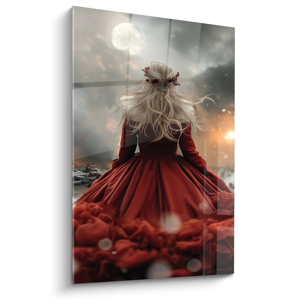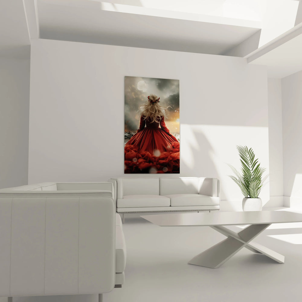 Cette décoration murale femme rouge dramatique crée un contraste saisissant entre la chaleur du rouge et la froideur des tons hivernaux. L'éclat lunaire apporte une dimension argentée qui unifie l'ensemble, tandis que les touches dorées suggèrent une source lumineuse chaude hors champ.