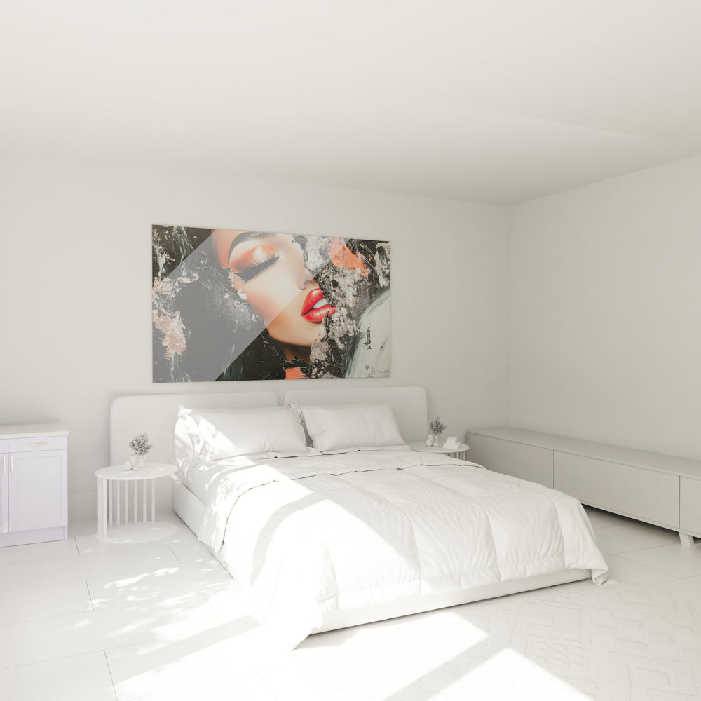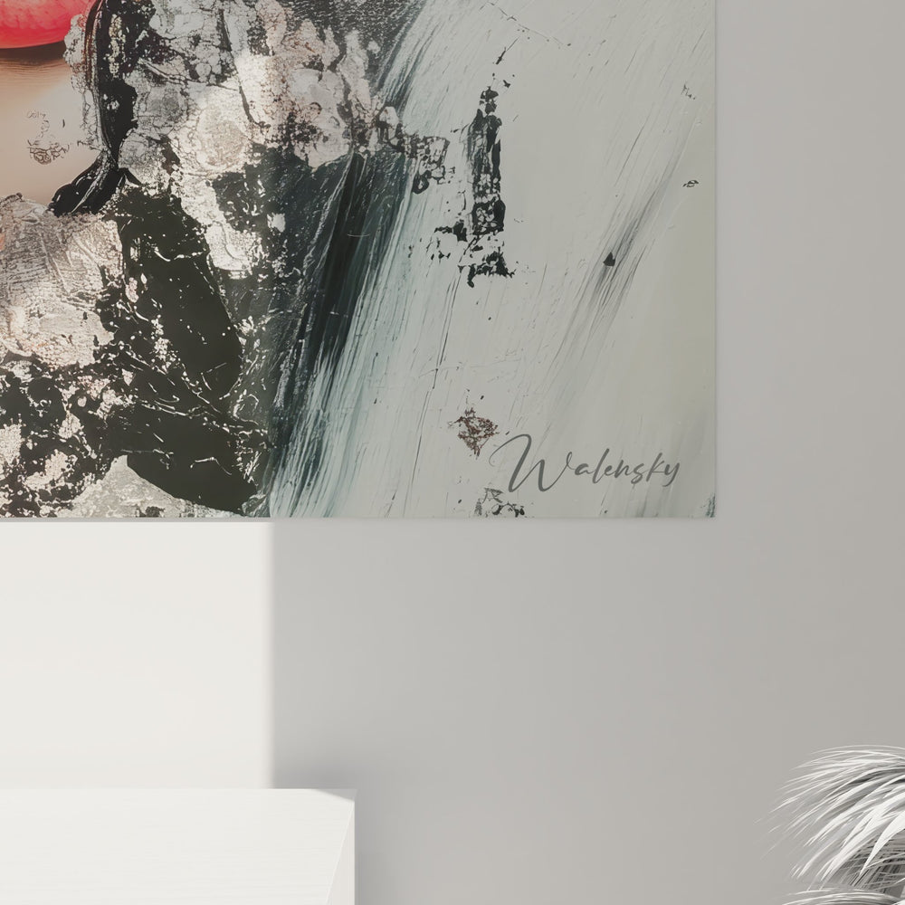 Ce tableau mural femme abstrait présente une œuvre saisissante où se mélangent réalisme photographique et art abstrait contemporain. Le portrait féminin de profil révèle des lèvres pulpeuses d'un rouge éclatant qui contrastent magnifiquement avec les textures grises et noires environnantes. L'œil de la femme, sublimé par un maquillage orange vibrant et des cils dramatiques, demeure fermé dans une expression de sérénité contemplative. La peinture abstraite murale intègre des éléments de collage urbain avec des fragments de matières texturées qui évoquent l'usure du temps et la poésie des murs décrépits. Les tons rouge et noir dominent cette composition où se rencontrent figuration et abstraction, créant un dialogue visuel captivant. Ce tableau décoratif moderne joue sur les contrastes entre la douceur du visage féminin et la rugosité des textures peintes. Les éclaboussures et coulures de peinture apportent une dimension spontanée à cette œuvre d'art murale, tandis que les nuances de gris créent une profondeur atmosphérique remarquable. Cette décoration murale contemporaine s'inscrit parfaitement dans les intérieurs modernes recherchant une pièce artistique forte et expressive.