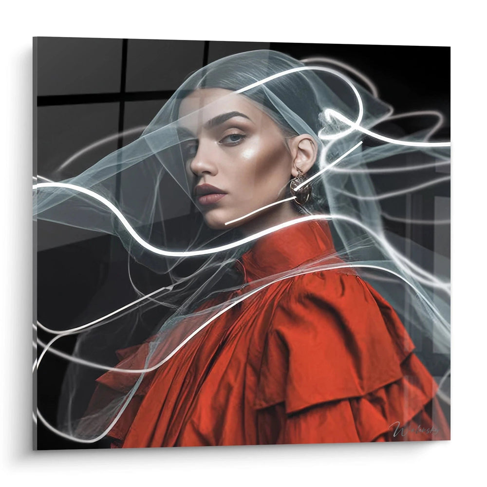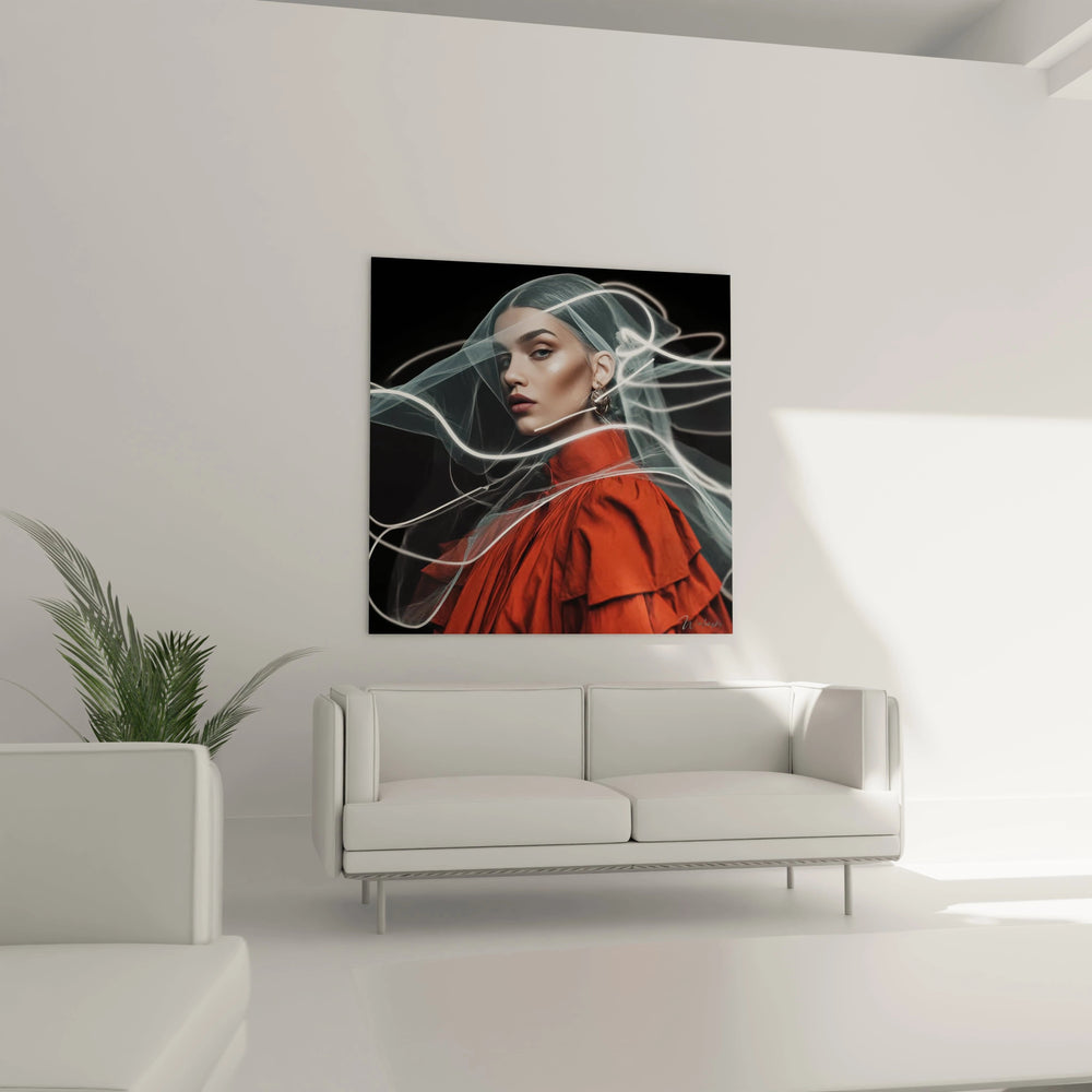 Ce tableau mural illustration de mode présente un portrait artistique contemporain d'une femme d'une beauté saisissante, capturant l'essence de l'élégance moderne. La composition met en scène une silhouette féminine aux traits délicatement sculptés, vêtue d'une robe rouge vermillon aux plis sophistiqués qui épouse gracieusement sa forme. L'arrière-plan noir profond crée un contraste dramatique qui fait ressortir chaque détail avec une intensité remarquable. L'élément le plus captivant de cette œuvre réside dans les voiles translucides qui semblent danser autour du personnage, créant des courbes organiques et fluides d'une poésie visuelle exceptionnelle. Ces draperies éthérées pour décoration murale, rehaussées par des lignes lumineuses blanches, ajoutent une dimension sculpturale à l'ensemble, évoquant un mouvement perpétuel figé dans l'éternité. L'éclairage maîtrisé révèle subtilement la texture nacrée de la peau et fait scintiller les bijoux dorés qui ornent les oreilles. La technique artistique utilisée mélange habilement photographie et illustration numérique de mode, créant des effets de transparence et de superposition qui confèrent à l'œuvre une qualité onirique. Cette composition transcende les frontières entre réalisme et abstraction, offrant une esthétique contemporaine raffinée qui séduit par sa modernité et son mystère. Ce tableau mode féminine s'intègre parfaitement dans un intérieur design moderne.
