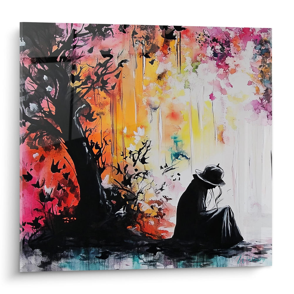 Ce tableau mural figuratif abstrait présente une composition saisissante où une silhouette féminine se dresse en contemplation sous un arbre aux couleurs flamboyantes. L'œuvre capture un moment de sérénité profonde, avec la figure féminine représentée dans des tons sombres qui contrastent magnifiquement avec l'explosion chromatique de la végétation environnante. L'arbre aux couleurs vives occupe la partie gauche de la toile, ses branches s'étendant en un festival de roses, d'oranges, de jaunes et de rouges qui semblent danser dans la lumière. Cette peinture moderne femme nature illustre parfaitement l'harmonie entre l'être humain et son environnement naturel. Les couleurs se fondent et se mélangent dans un style semi-abstrait, créant des effets de transparence et de superposition qui donnent vie à l'ensemble. La technique picturale employée révèle des coulures artistiques qui ajoutent une dimension dynamique à l'œuvre, suggérant le mouvement et la fluidité du temps qui passe. Ce tableau décoratif moderne transforme l'espace en créant une atmosphère contemplative et apaisante, invitant le spectateur à la méditation et à la réflexion sur la beauté de la nature.