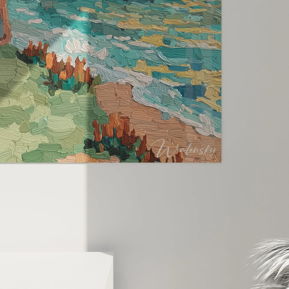 L'originalité de cette œuvre réside dans sa capacité à transformer une scène maritime classique en vision contemporaine grâce à sa technique expressive et sa palette chromatique audacieuse. Les détails impossibles à reproduire incluent les variations subtiles dans l'épaisseur des empâtements et les effets de transparence obtenus dans certaines zones des vagues. Cette art mural femme océan présente également une signature gestuelle unique dans le traitement des formations nuageuses, où chaque coup de pinceau semble porter l'émotion de l'instant créatif. Les aspects visuels les plus remarquables concernent l'interaction entre la matière picturale et la lumière naturelle, créant des effets de profondeur variables selon l'angle d'observation.