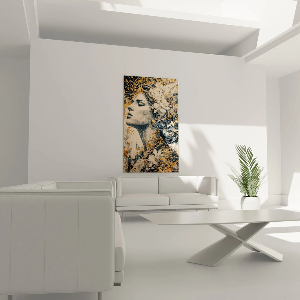 Ce tableau femme décoration intérieure s'épanouira parfaitement dans un environnement aux tons neutres qui permettront aux dorés de ressortir avec éclat. Un éclairage LED chaud dirigé depuis le haut gauche révélera toute la splendeur des détails floraux tout en préservant la douceur du portrait. Cette décoration murale femme élégante trouvera sa place idéale dans un salon aux murs blanc cassé ou beige, associée à des éléments décoratifs dans les tons or et bronze. Les meubles en bois clair ou les structures métalliques dorées créeront des échos harmonieux avec l'œuvre. Un encadrement sobre dans des tons dorés ou bronze sublimera cette création sans l'écraser.