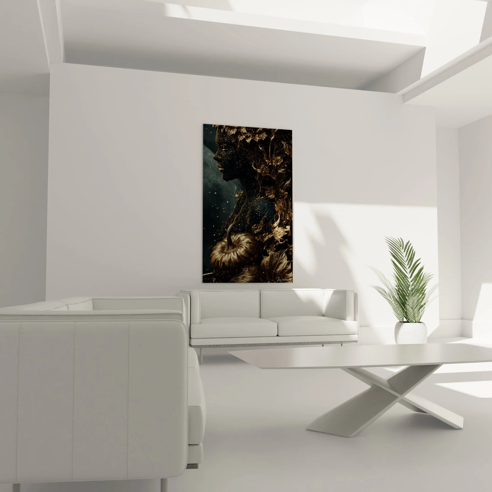 Cette œuvre captivante présente une tableau femme dans un style baroque contemporain d'une richesse visuelle exceptionnelle. La composition révèle un profil féminin délicat aux tons nacrés, harmonieusement intégré à un environnement végétal luxuriant dominé par des dorures éclatantes. Le tableau femme citrouille dorée se distingue par sa palette chromatique sophistiquée mêlant les noirs profonds aux reflets métalliques cuivrés. L'artiste a créé une décoration murale femme d'une élégance raffinée où chaque détail contribue à l'atmosphère mystérieuse et envoûtante de l'ensemble.