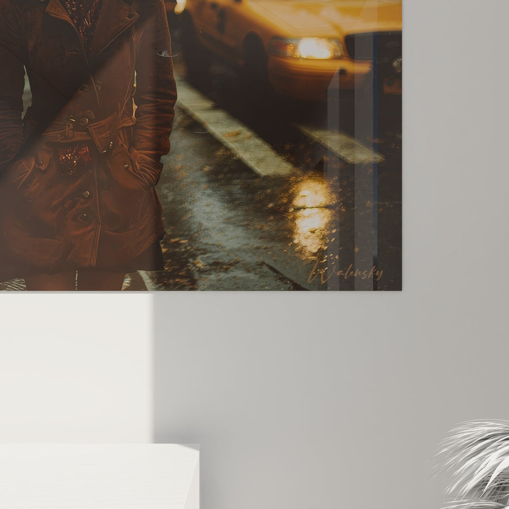 Ce tableau mural femme New York capture avec une intensité saisissante l'atmosphère mélancolique d'une soirée pluvieuse dans les rues de la métropole. L'œuvre dépeint une jeune femme aux cheveux bruns ondulés, vêtue d'un manteau sombre, évoluant dans un décor urbain typiquement new-yorkais. Les reflets dorés sur l'asphalte mouillé créent une ambiance cinématographique remarquable, tandis que les célèbres taxis jaunes illuminent l'arrière-plan de leurs phares chaleureux. Cette peinture street art moderne révèle un traitement photographique exceptionnel où chaque détail contribue à l'émotion générale. Les immeubles en brique rouge caractéristiques de Manhattan se dressent majestueusement, créant un contraste saisissant avec le ciel gris orageux. L'artiste a su capturer cette esthétique urbaine authentique qui fait le charme intemporel de New York. Ce tableau décoratif ville moderne transformera instantanément votre intérieur en lui apportant une dimension artistique contemporaine. La composition équilibrée entre premier plan et arrière-plan témoigne d'une maîtrise technique remarquable, faisant de cette œuvre un véritable art mural contemporain New York.