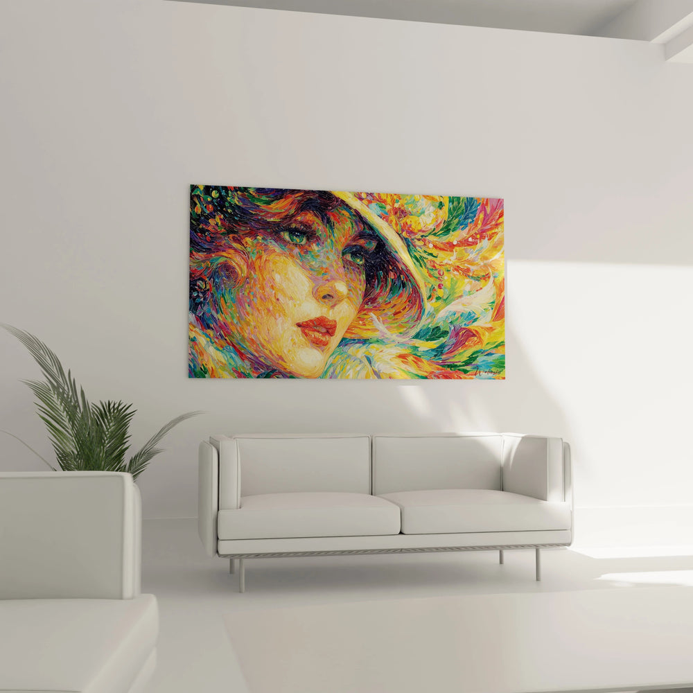 Les éléments distinctifs de cette art mural femme unique résident dans plusieurs caractéristiques impossibles à dupliquer. L'expression du regard, à la fois mélancolique et déterminée, crée une connexion émotionnelle immédiate. Les cheveux, traités comme une cascade de couleurs mouvantes, génèrent un dynamisme rarement égalé. La technique du rendu de la peau, oscillant entre réalisme et expressionnisme, confère une dimension presque sculpturale au visage. Les lèvres carmin, délicatement modelées, apportent un point focal supplémentaire qui renforce l'intensité de l'ensemble. Cette décoration murale femme expressionniste moderne se distingue par sa capacité à fusionner technique traditionnelle et vision contemporaine, créant une œuvre totalement originale et reconnaissable.